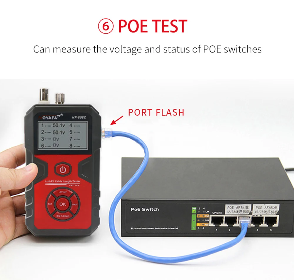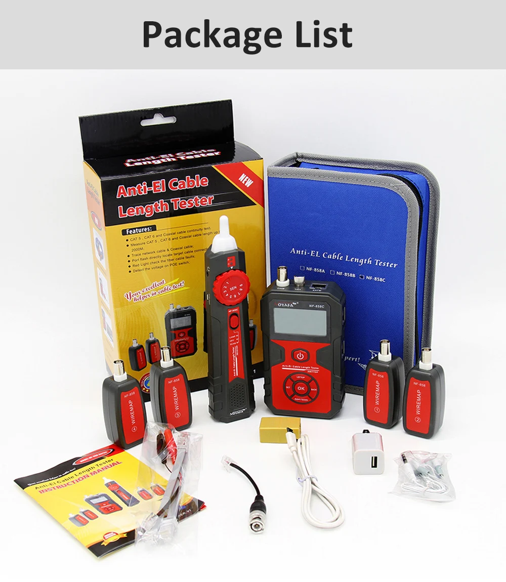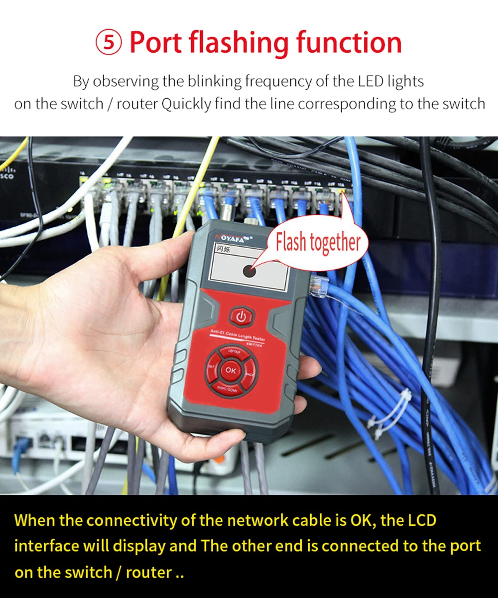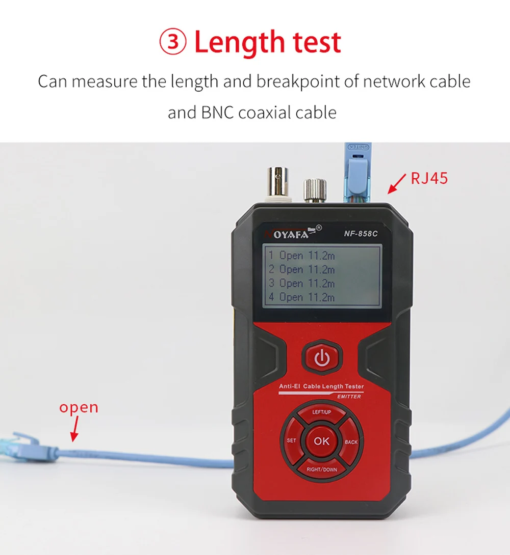 3. It can measure the length and breakpoints of network cables, BNC coaxial cables by the method of open circuit, the length of cables can be measured up to 2000 meters, and the accuracy of measuring the length of cables and the location of breakpoints can reach 98%.