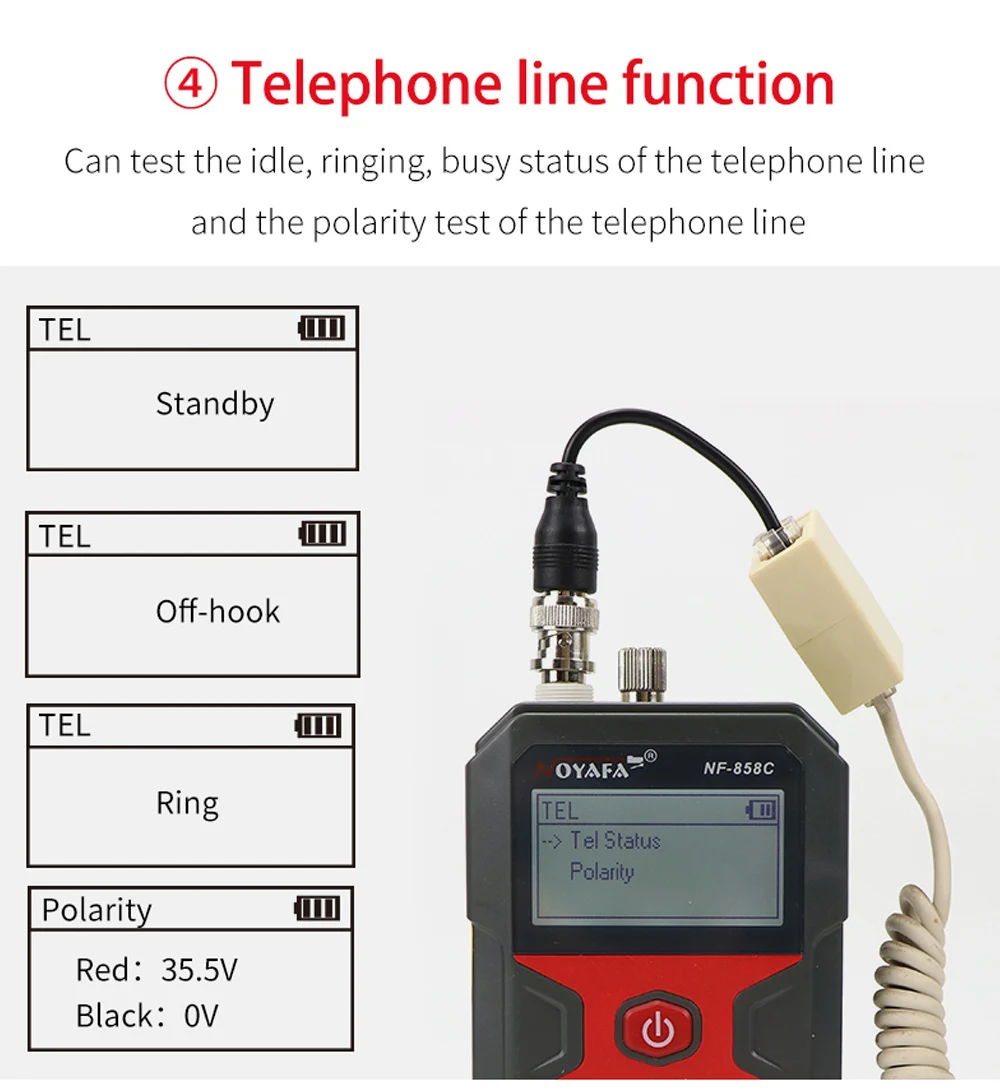 1. Can use the host and the remote to test the open circuit, short circuit, open circuit, cross, reverse connection of the network cable, BNC video cable, etc., and display it visually on the LCD.