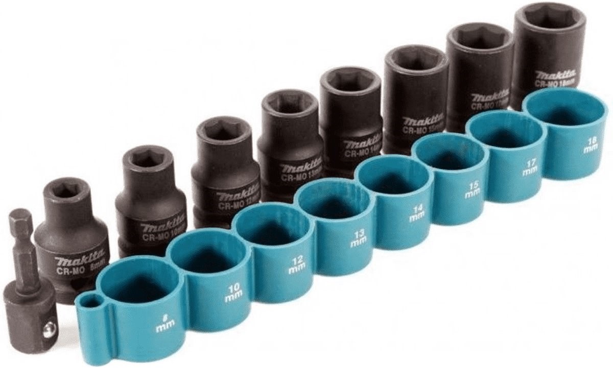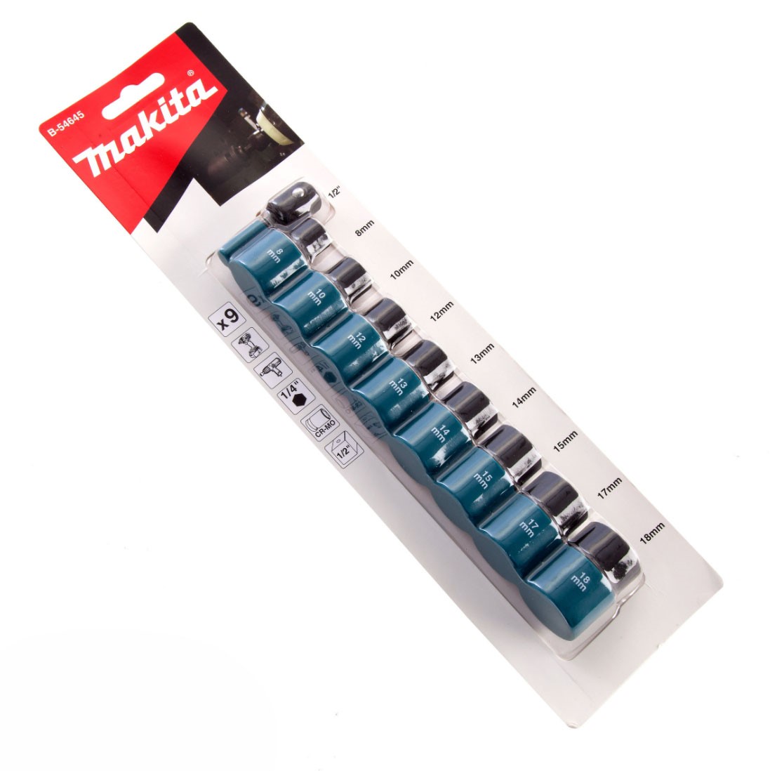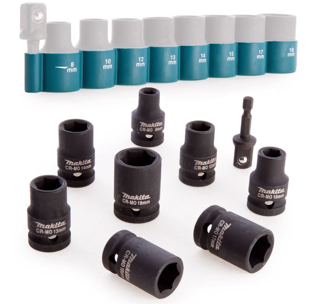 Makita 9 Piece Impact Driver Socket Set 1/2" Square Drive + 1/4" Hex Bit 8-18mm
