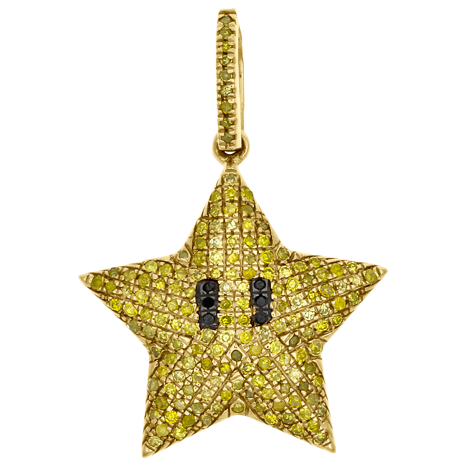 (2.7 gr. 10k Yellow Gold | Total Carat Weight: 0.41 ct. t.w. of Yellow and Black Diamonds | Length: 1" (including bail) | Width: 0.70" | Clarity: I1 - I2 | Color: I - J | Unisex Genuine Diamond Domed / Puffed Star w/ Black Diamond Eyes Pendant Pave Charm)