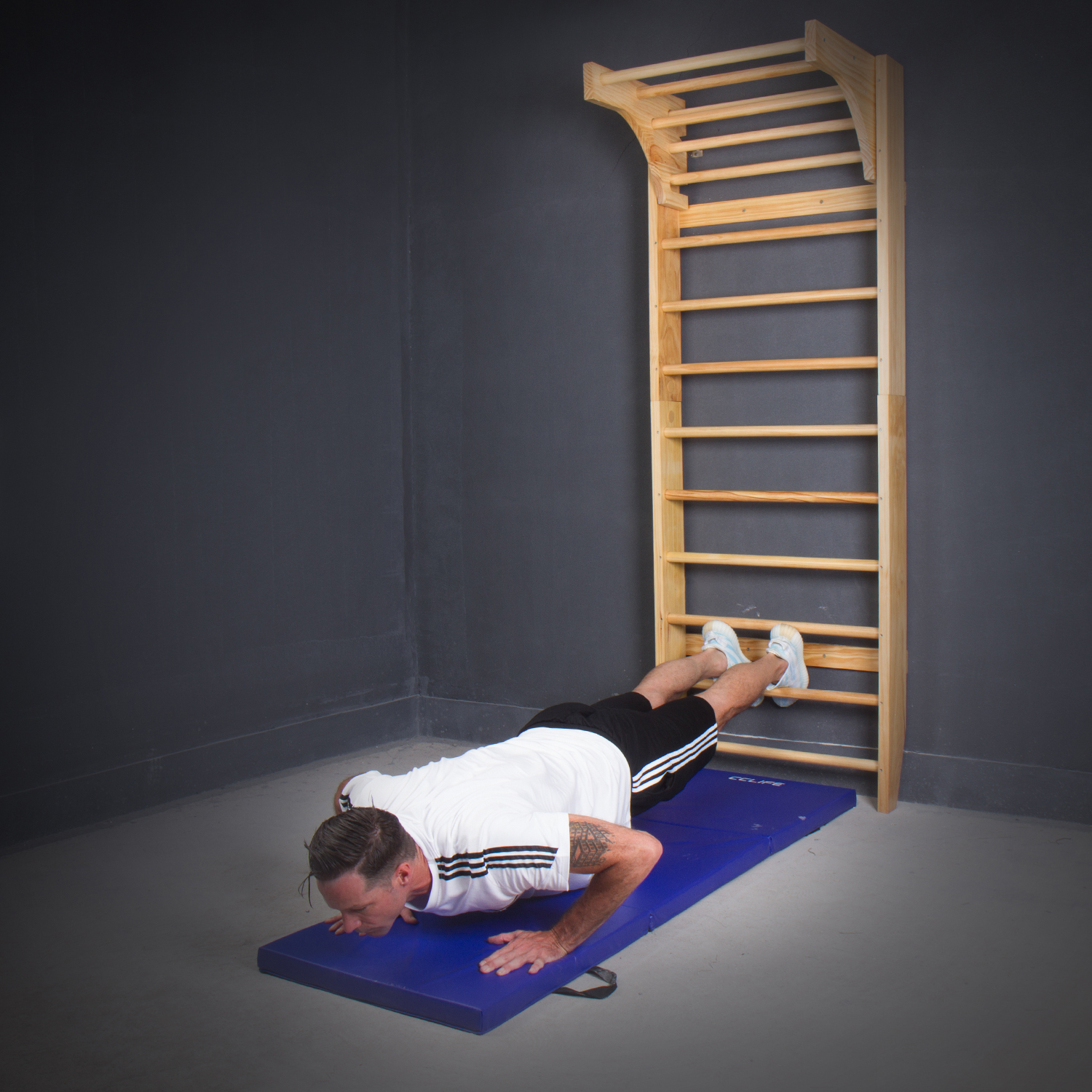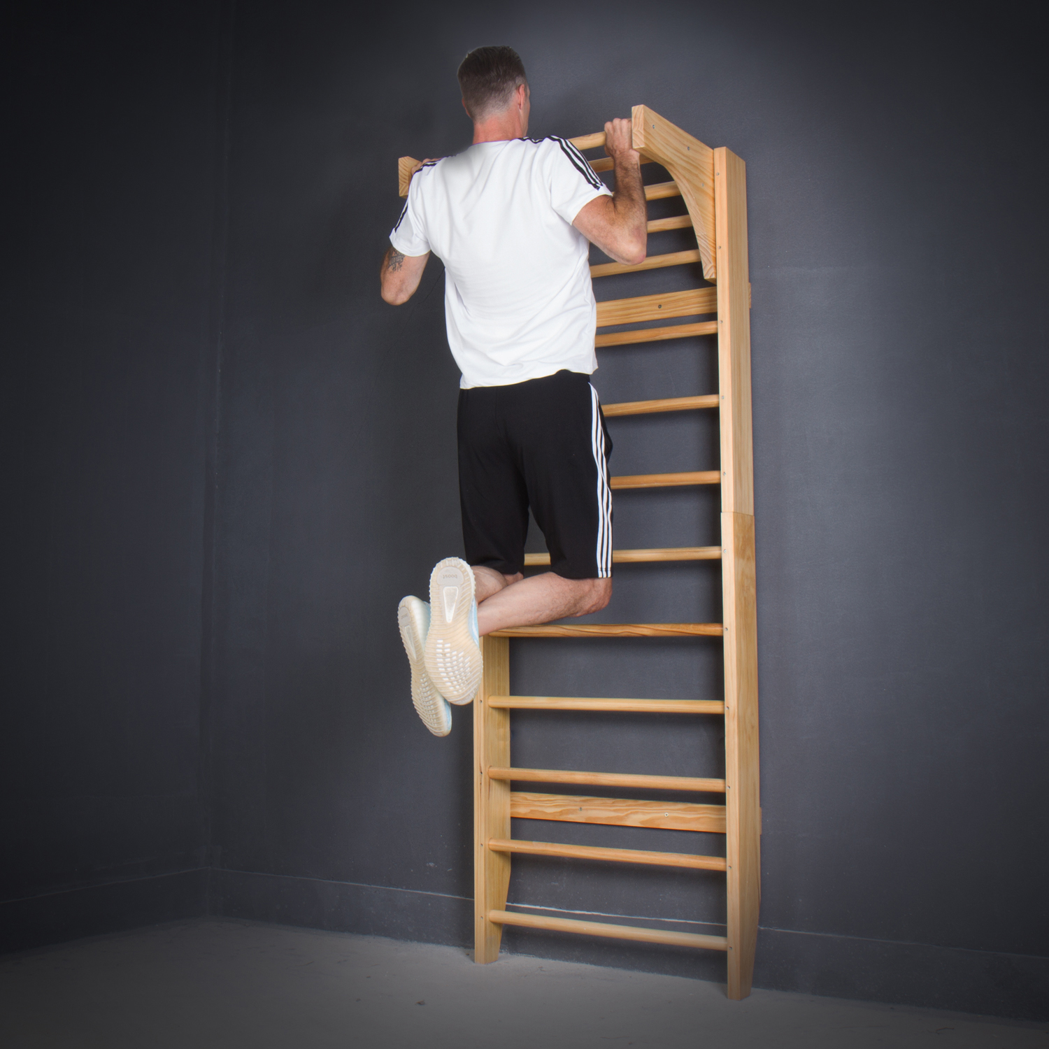- Stabile Sprossenwand aus Massivholz (Kiefer).