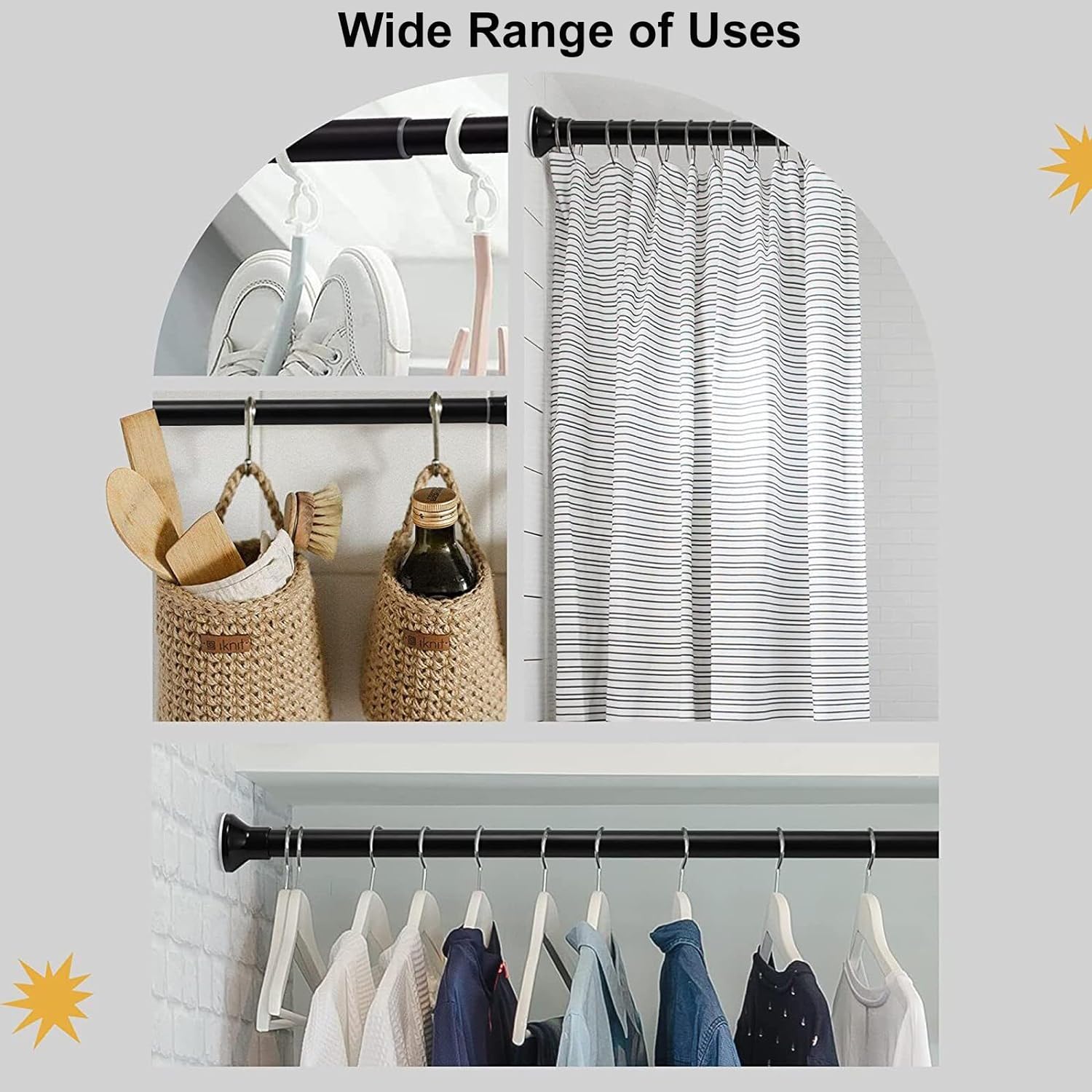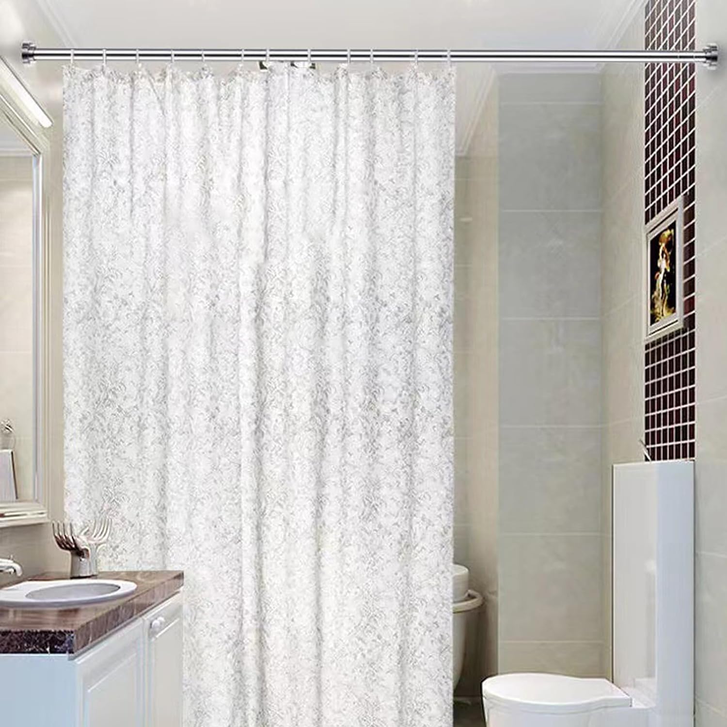 - Versatile Use: Suitable for various settings, including the bathroom, bedroom, shower stall, bathtub, changing area, window opening, doorway, and more. It can function as a curtain rod, shower curtain pole, cupboard bar, or wardrobe clothes hanger, or even serve as a balcony hanging rail.