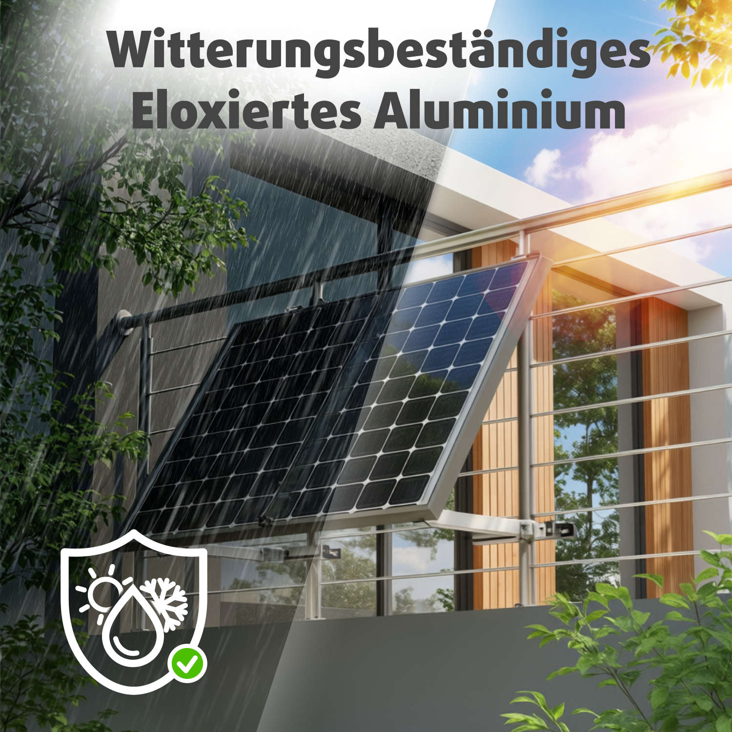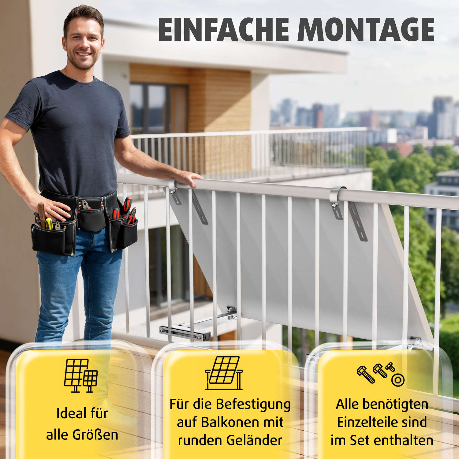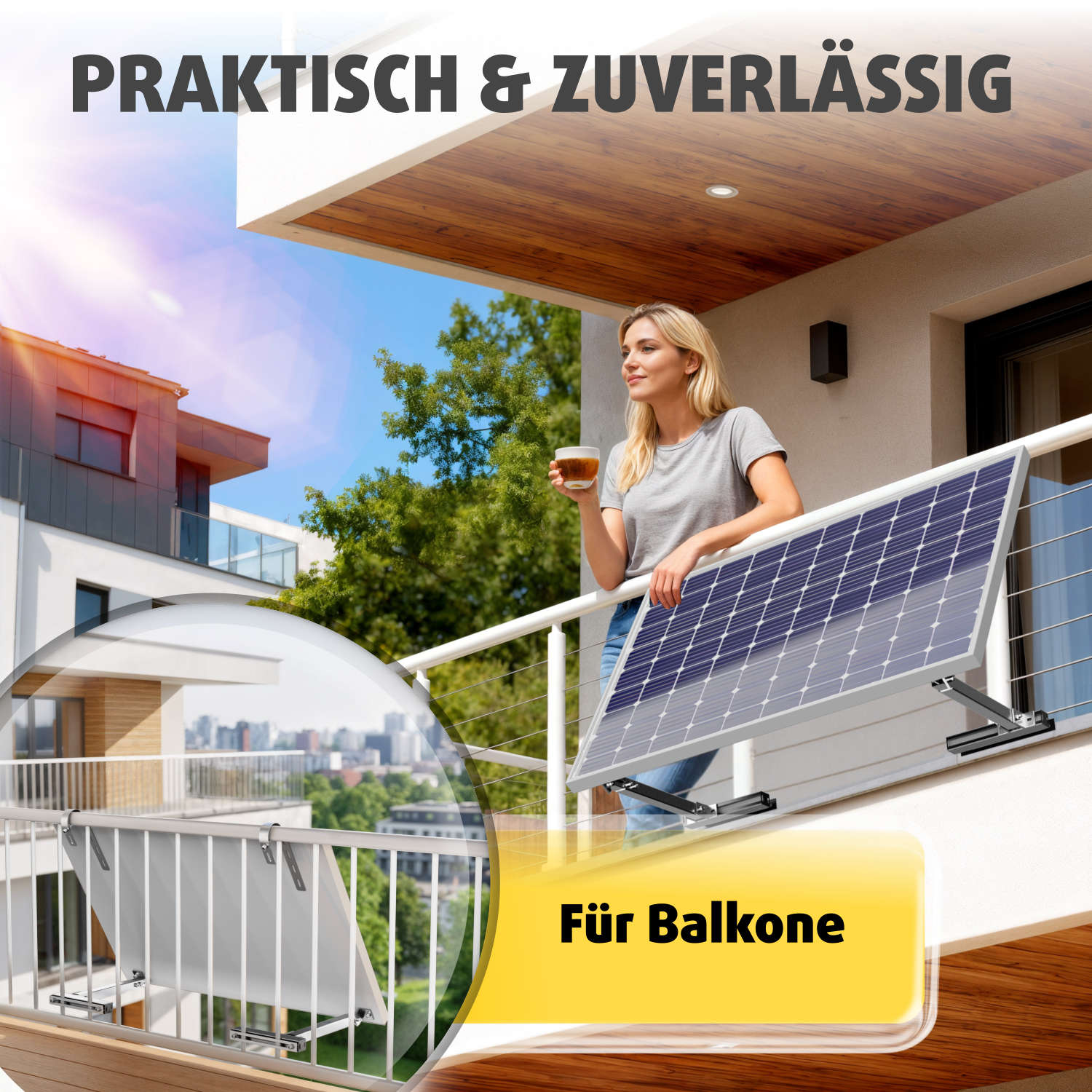 Die Vorteile der Solarenergie erleben mit unserer verstellbaren Avoltik Solarmodul Halterung. Diese Befestigungsmontage für Balkonkraktwerke, eignet sich perfekt für Balkongeländer und erfordert kein Bohren. Die Avoltik Aufständerung ist aus einer Aluminiumlegierung gefertigt, was ihr ein geringes Gewicht verleiht und dennoch eine hohe Tragfähigkeit und starke Stabilität gewährleistet. Unsere PV-Aufständerung ist für Solarmodule aller Größen geeignet. Die Halterung kann schnell und einfach montiert werden, während die präzise Lochplatzierung eine präzise Justierung ermöglicht. Die hochwertige Halterung eignet sich perfekt für die Solarpanelhalterung auf Balkongeländern. Alle benötigten Einzelteile sind im Set enthalten, einschließlich Schrauben, Muttern, Gummischutz, Scheiben, Schienen und Haken, die jeweils für ein Modul geeignet sind.