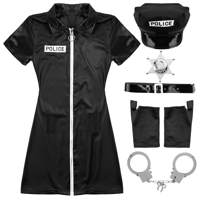 Women’s police officer costume Halloween cop uniform outfit, costume dress paired with hat, badge, belt, cuffs and gloves.