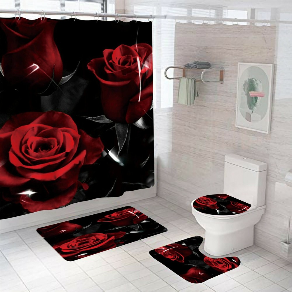 Rose Shower Curtain Rug Set Thick Bath Mat Non-Slip Bathroom Toilet Lid Cover