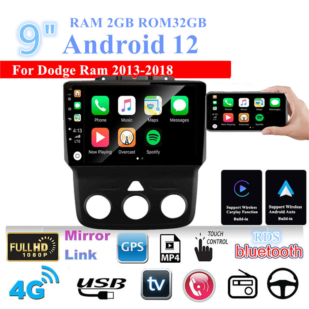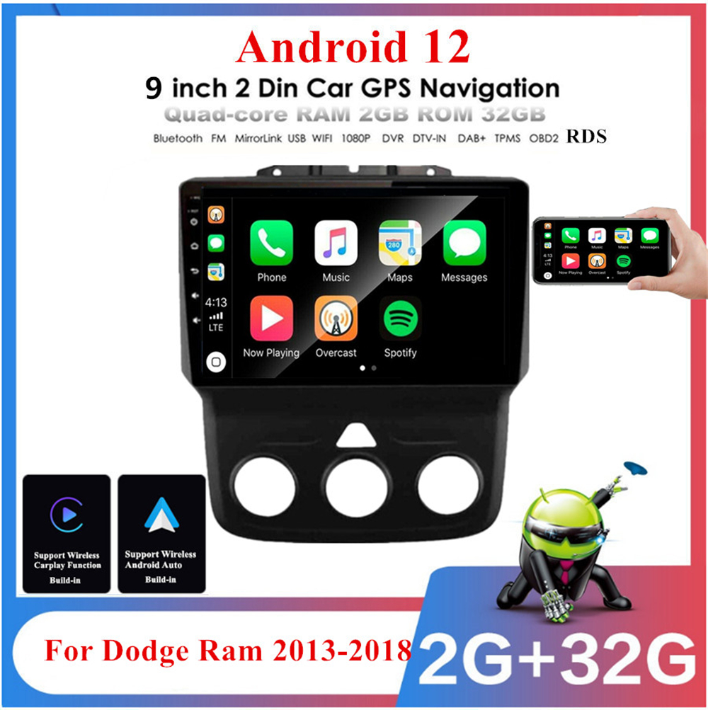 9'' For Android 12 Build-In For Support Wireless Carplay Android Auto RAM 2GB ROM 32GB Car Stereo Radio GPS WIFI 3G 4G BT DAB Mirror Link OBD RDS For Dodge RAM 1500 2500 3500 4500 5500 2013-2018 Manual AC