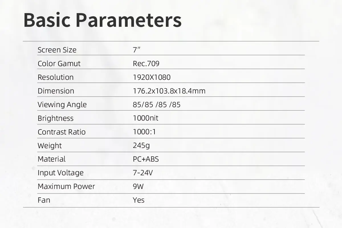 - 7-inch, 10-bit panel with a resolution of 1920 x 1080 and a 1000:1 contrast ratio.