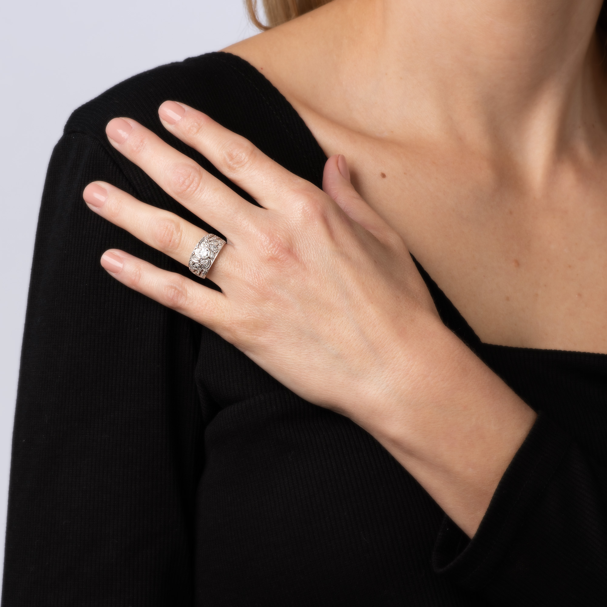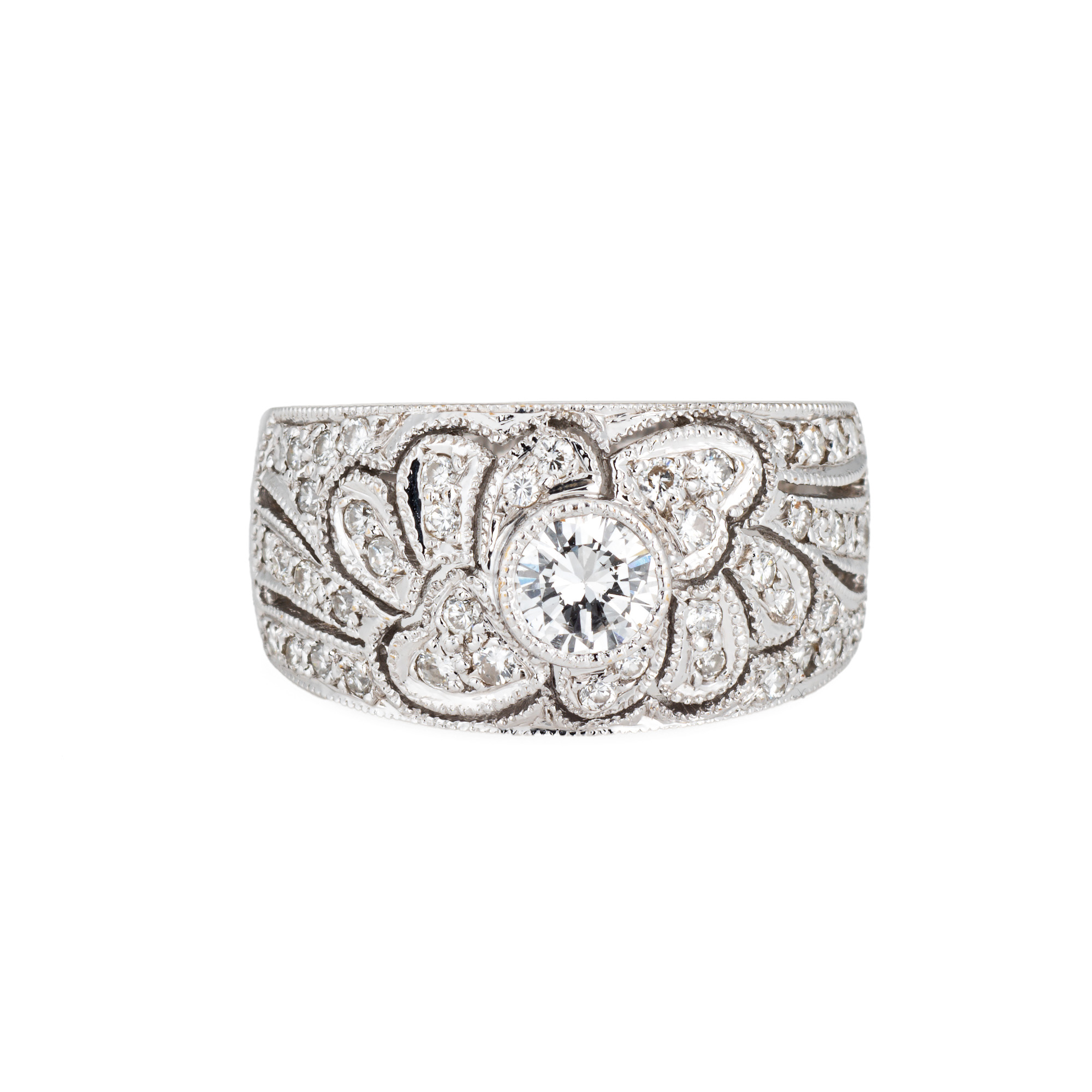 Overview: Stylish estate diamond half band crafted in 18 karat white gold. Diamonds total an estimated 0.50 carats (estimated at H-I color and SI1-I1 clarity). Set with shimmering diamonds in a scrolled pattern, the ring makes a statement! The wide band (10mm - 0.39 inches) is great worn alone as a statement ring, or stacked. The low rise ring (5mm - 0.19 inches) sits comfortably on the finger. The ring is in very good condition and was lightly cleaned and polished. Particulars: Weight: 6.1 grams Stones: Diamonds total an estimated 0.50 carats (estimated at H-I color and SI1-I1 clarity). Metal & Hallmark: 18 karat white gold. The ring is hallmarked "18k"Size & Measurements: The ring is a size 5 1/2 (sizable). The band measures 10mm wide (0.39 inches) rising 5mm from the finger.
