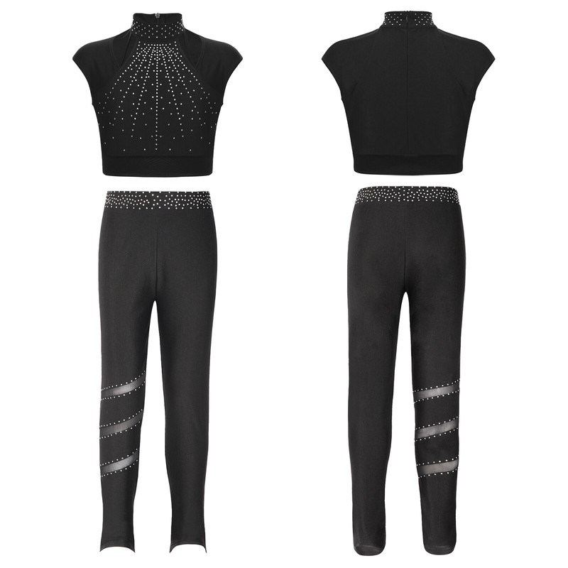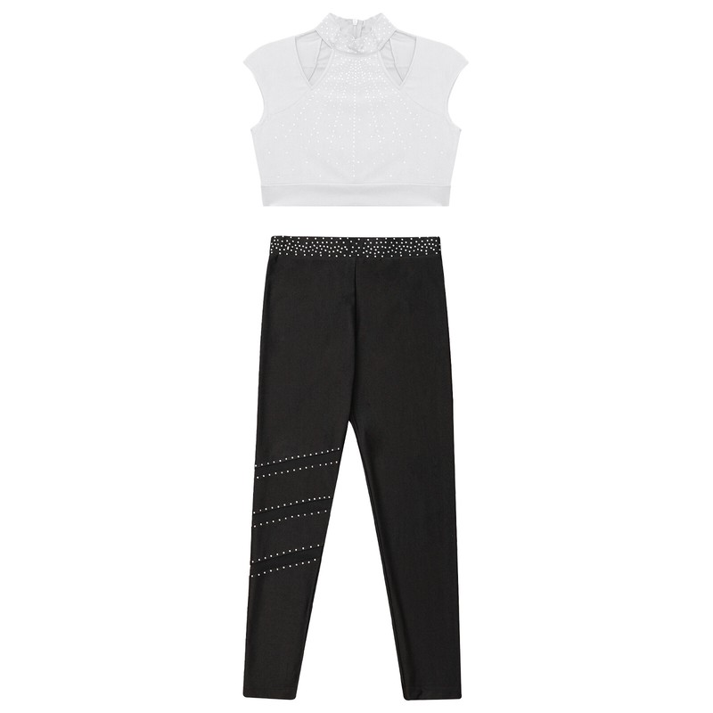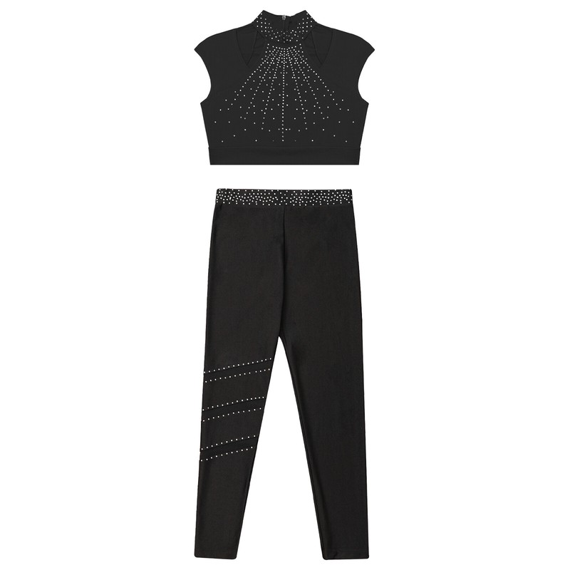 Girl’s top is decorated with shiny rhinestones to brighten up any performance and create an eye-catching effect.