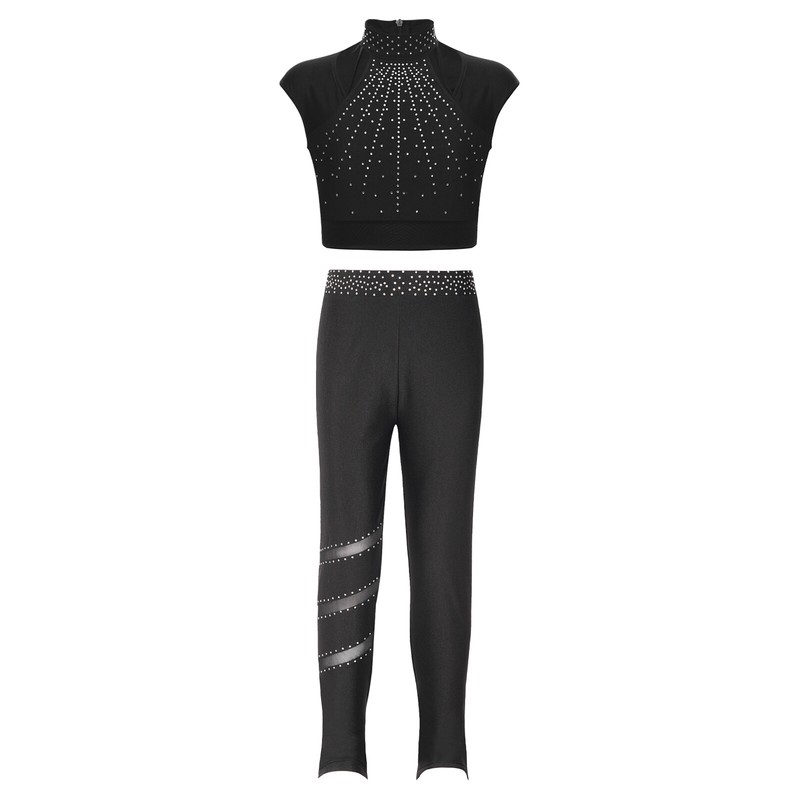 Figure skating pants with rhinestones and three sheer mesh stripes on the right leg to make your child stand out.