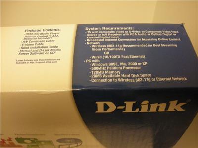 [View Image] D-Link's DSM-320 Wireless Media Adapter is a next generation multimedia product that streams all your favorite media files to your home entertainment center. It supports 802.11g wireless standards with transfer speeds up to 54Mbps. The DSM-320 supports all popular media formats including MP3, WAV, and WMA for audio files, MPEG1/2/4, AVI, and DivX4/5 for video, and JPEG, GIF, BMP, and PNG for images. Plug the DSM-320 directly into your TV to easily access all your media content through the user-friendly TV interface with the included remote control. Experience your digital media like never before with the DSM-320 Wireless Media Adapter.
