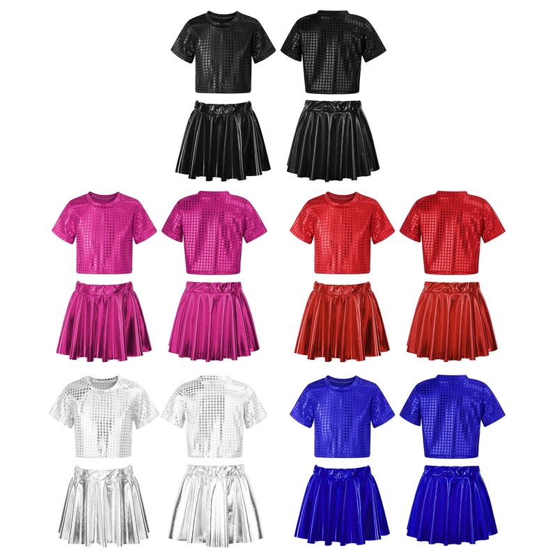 Kids Girls Skating Dress Dance Outfits Round Neck Dresses Glittering Dancewear