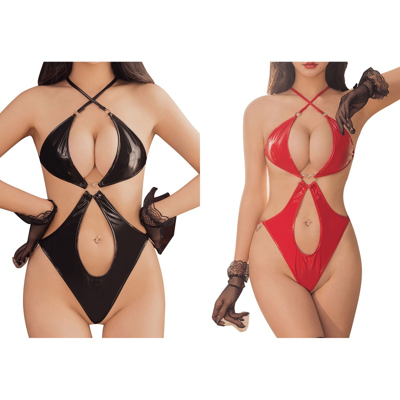 Halter straps and waist strings, jointed by metal ring. Front V neckline, and backless style.