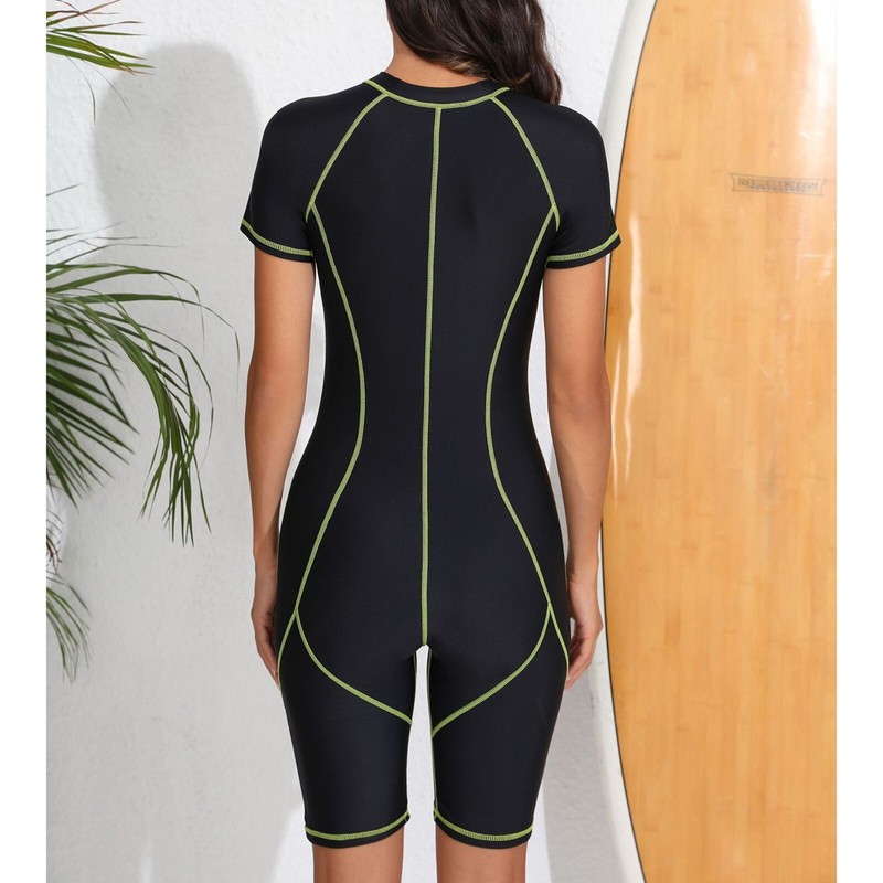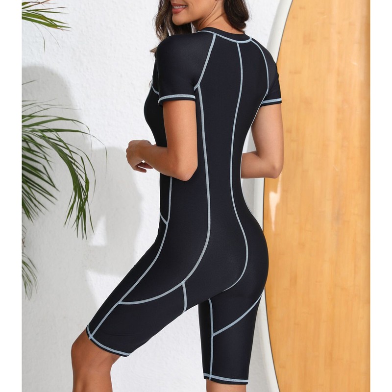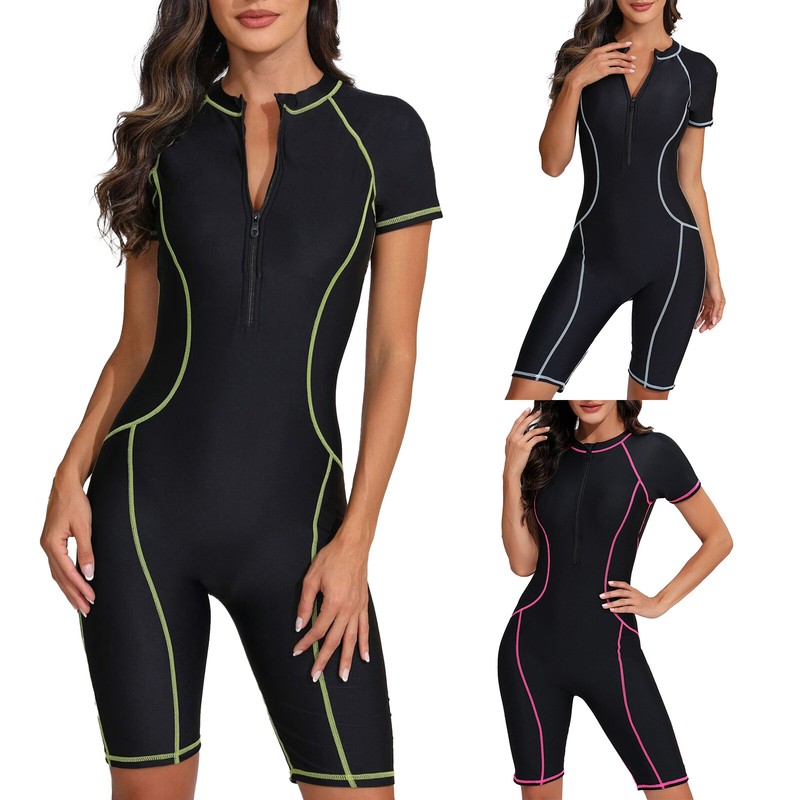 Designed with short sleeve, chest pads, boyleg short athletic swimsuit, front zipper closure is easy to wear.