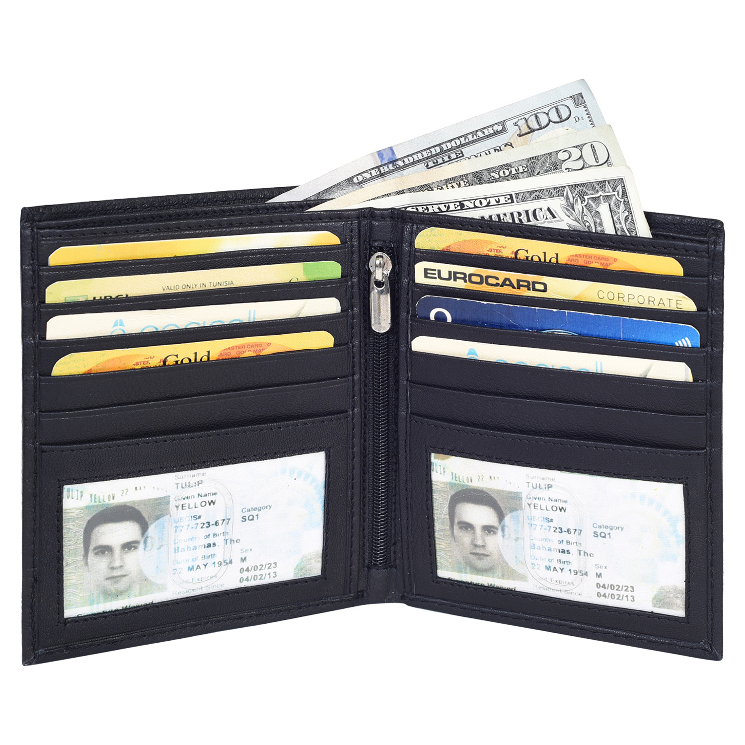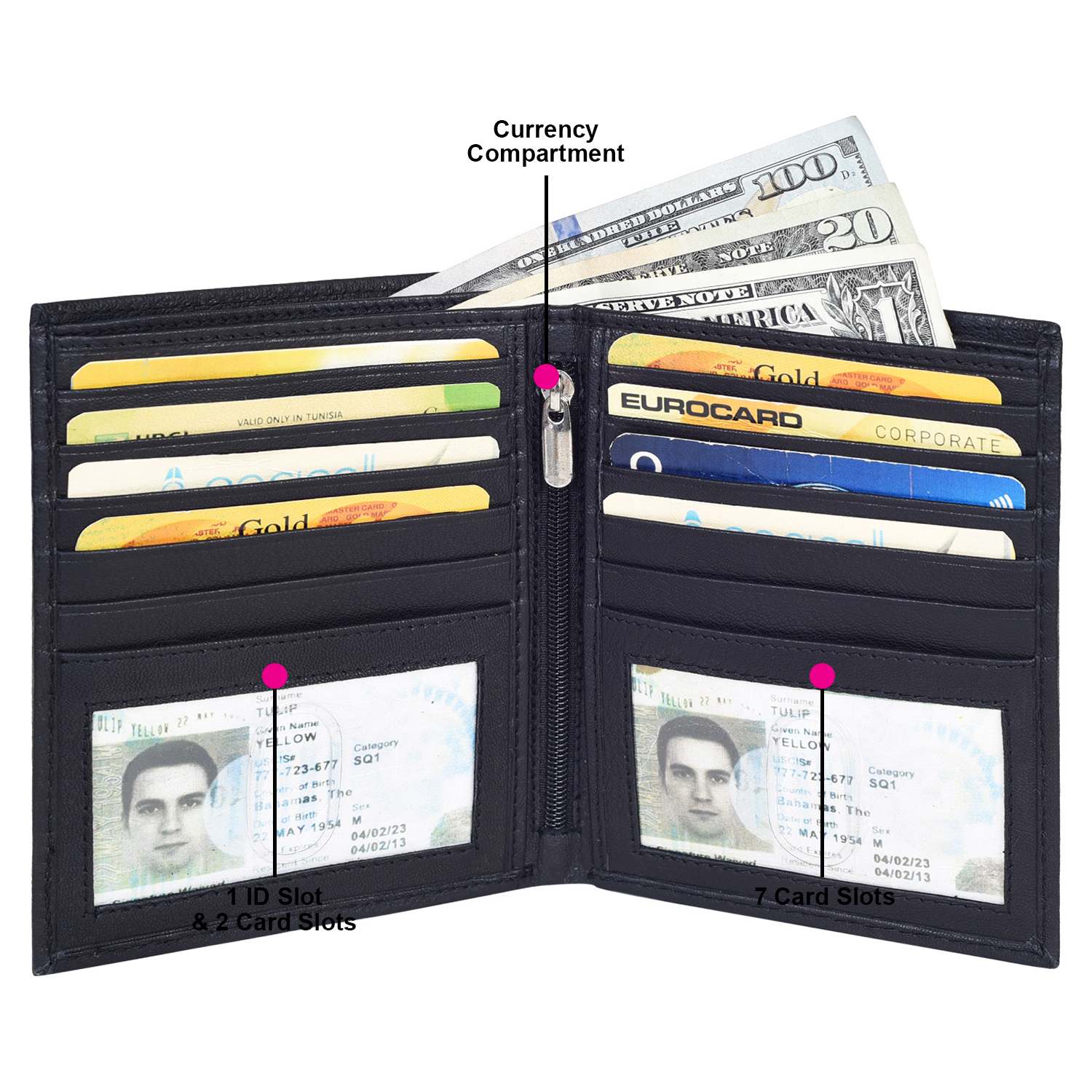 storage for up to 10 credit cards, 2 ID windows, a money compartment, and a