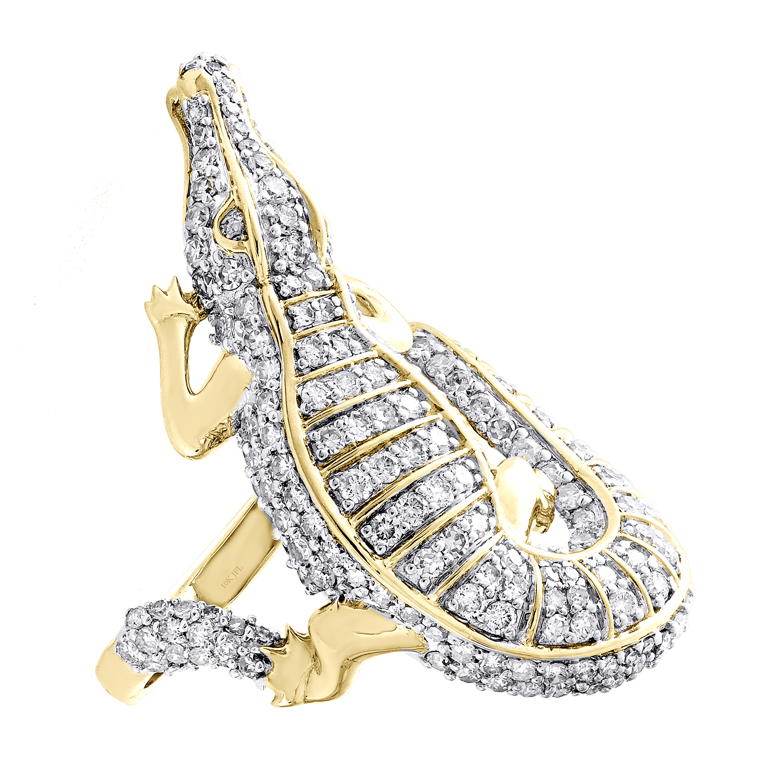 This exquisite diamond Alligator / Crocodile Frame Right Hand Cocktail Ring, casted in 10K Yellow Gold. Radiant with 1.62 ct. t.w. of Round cut diamonds and high polished to a bright lustrous shine. This statement ring will sparkle for a lifetime, a look she'll always treasure. Diamonds are Prong set in-between the gold mounting in a wrap style design with rows of round diamonds for a unique look. The diamonds are hand set precisely to give it a smooth uniform flow. Solid mounting, the ring weighs approx. 4.7 gr. All diamonds in this ring are matching in clarity and color. Currently this ring is ladies size 7, if you would like this ring in a different size please message us, for resizing charges and we will get back to you right away. This ring can be sized at your local jeweler as well.