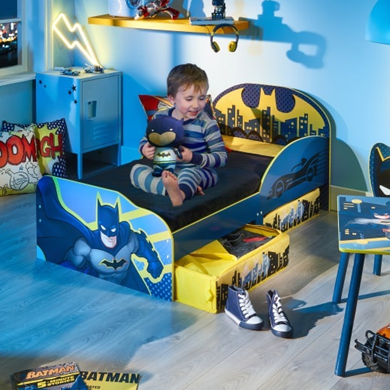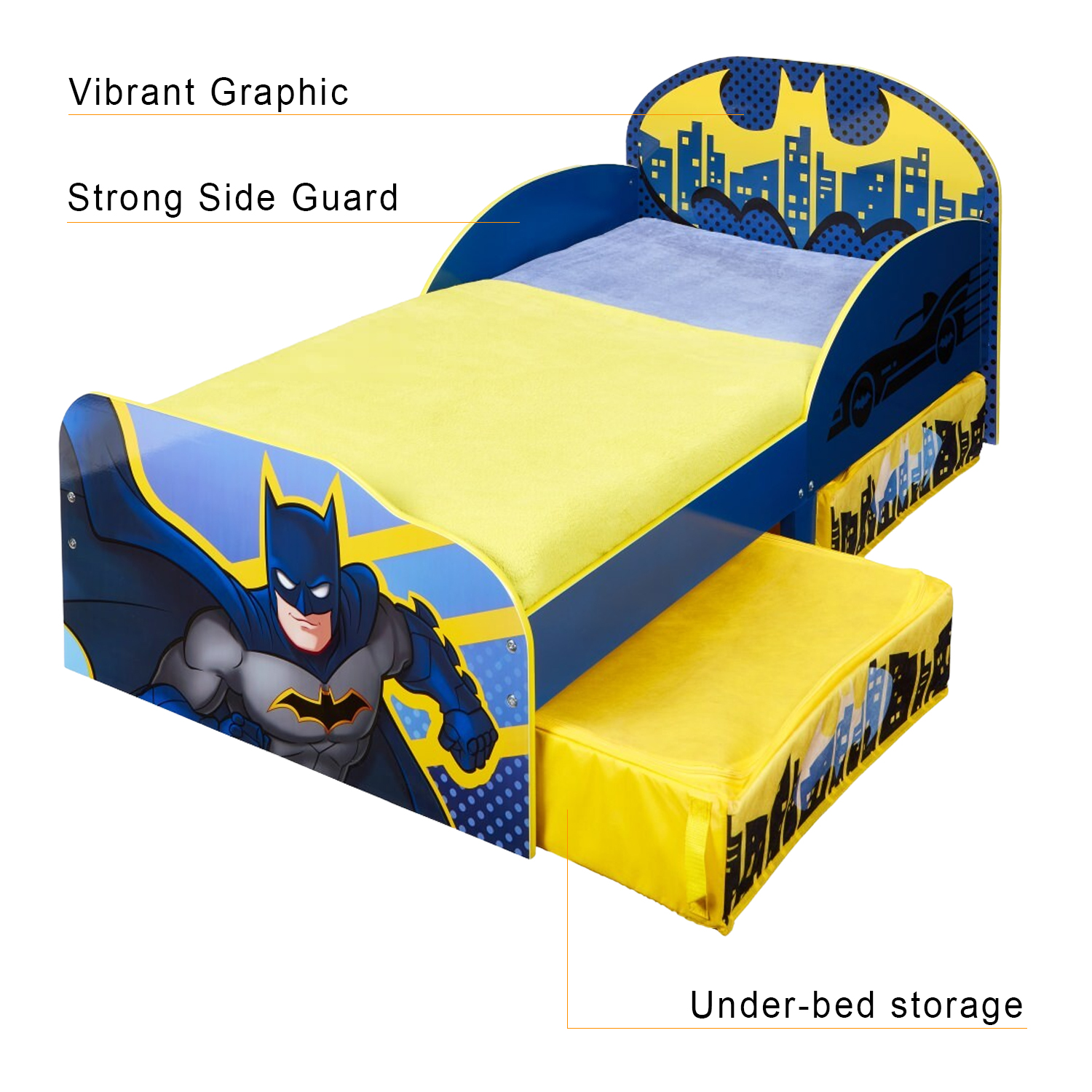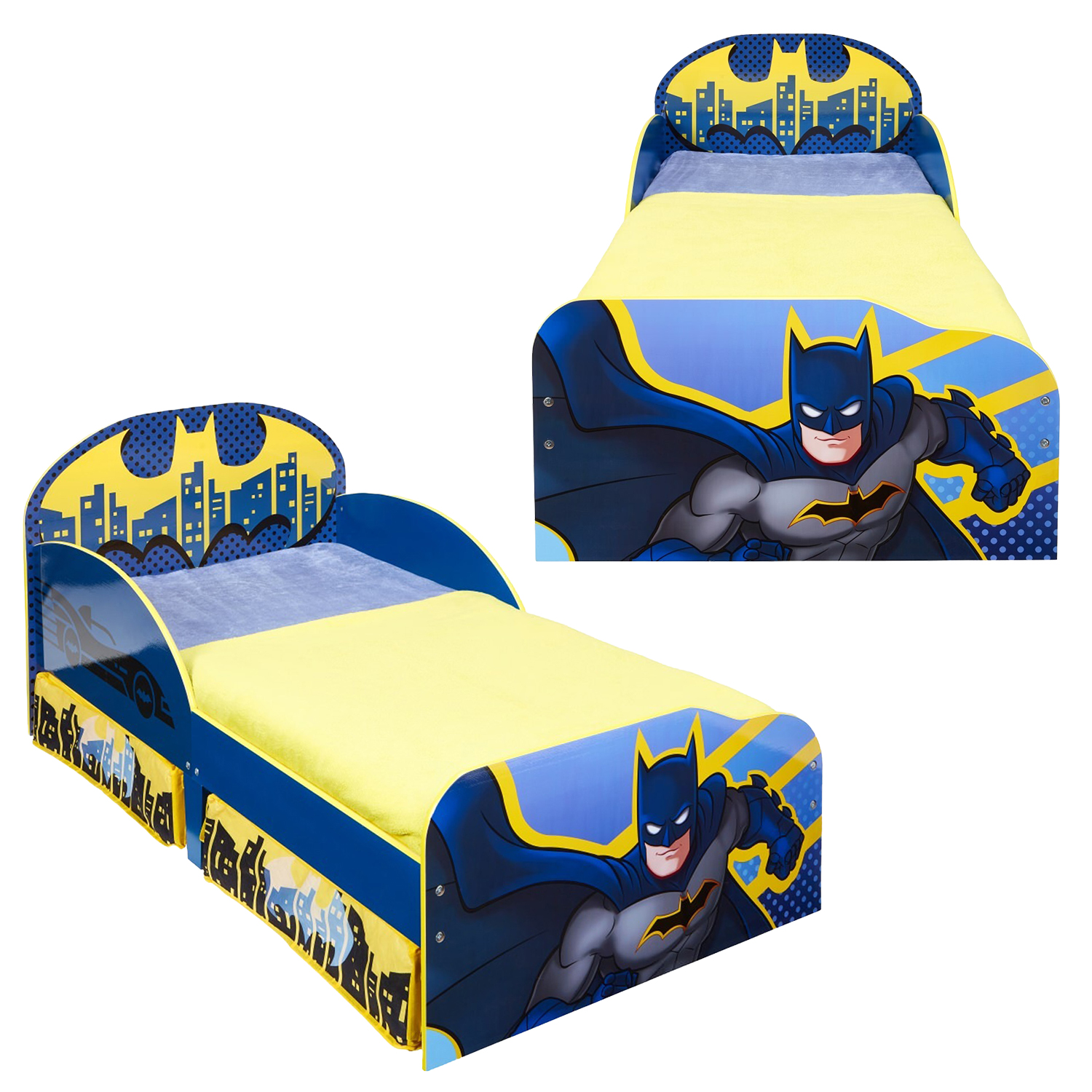 Immerse your little superhero in the thrilling world of Gotham City with the Batman Kids Toddler Bed with added under bed storage.