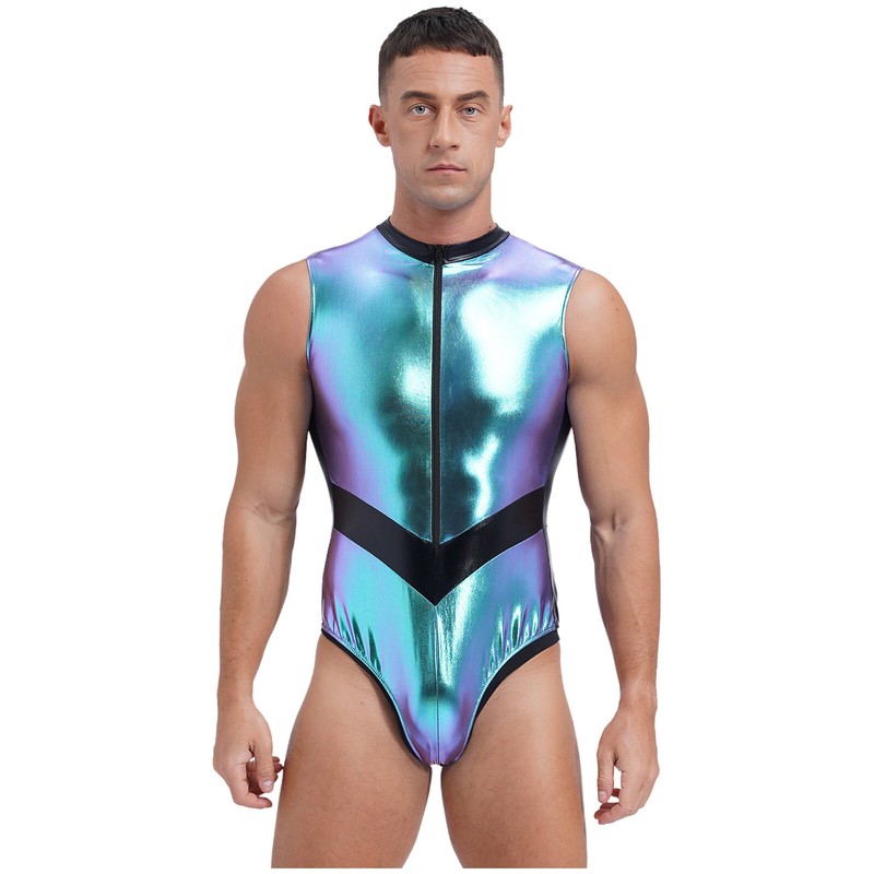 Sleeveless bodysuit for men, fashionable color block, shiny surface, make you more eye-catching in the crowd.