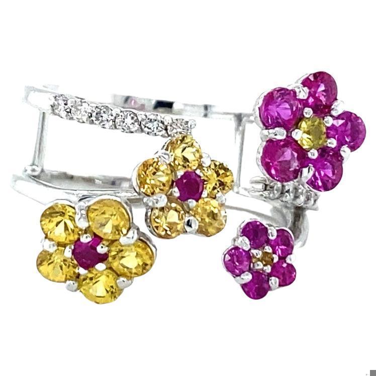 A Uniquely designed Multi-Colored Sapphire and Diamond Ring that is sure to be a great addition to your jewelry collection! Looks great on any finger and is somewhat adjustable in size.