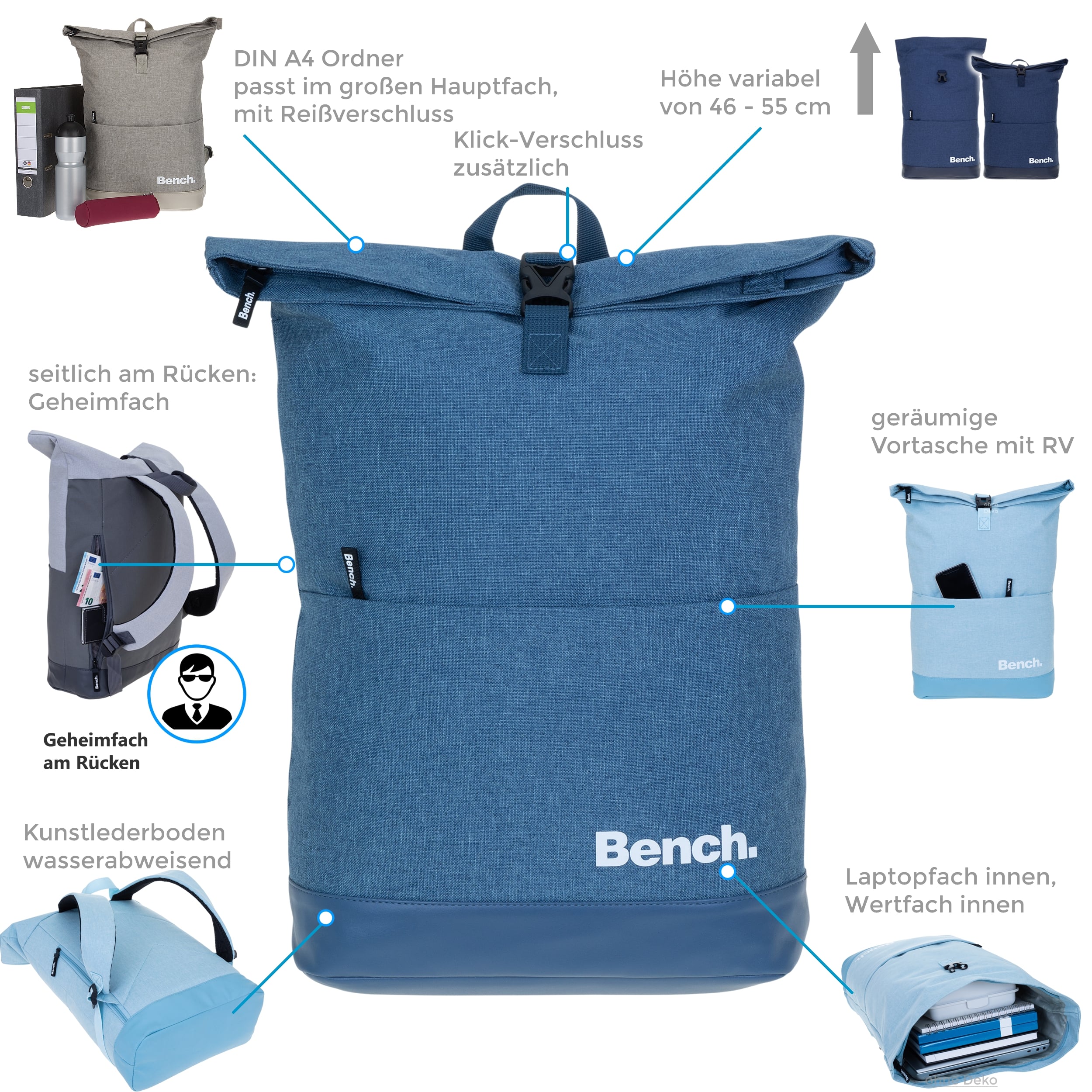 BENCH Rucksack Roll-Top Classic, Größe Large. Neustes Modell. Viel Stauraum (19 L), ein Laptopfach (36x27 cm) und das Melange-Material zeichnen diesen Rucksack aus. Eine Vortasche und ein Wertfach sind zusätzlich mit an Bord. Die Polsterträger erleichtern das Tragen und der Kunstlederboden schützt den Inhalt von unten. Das Kurier-Design ist recht zeitlos und passt auch ins Büro. Blitzschnell versendet vom Fachhändler. Tolles Geschenk für Damen uns Herren.. Welcher ist Deiner?