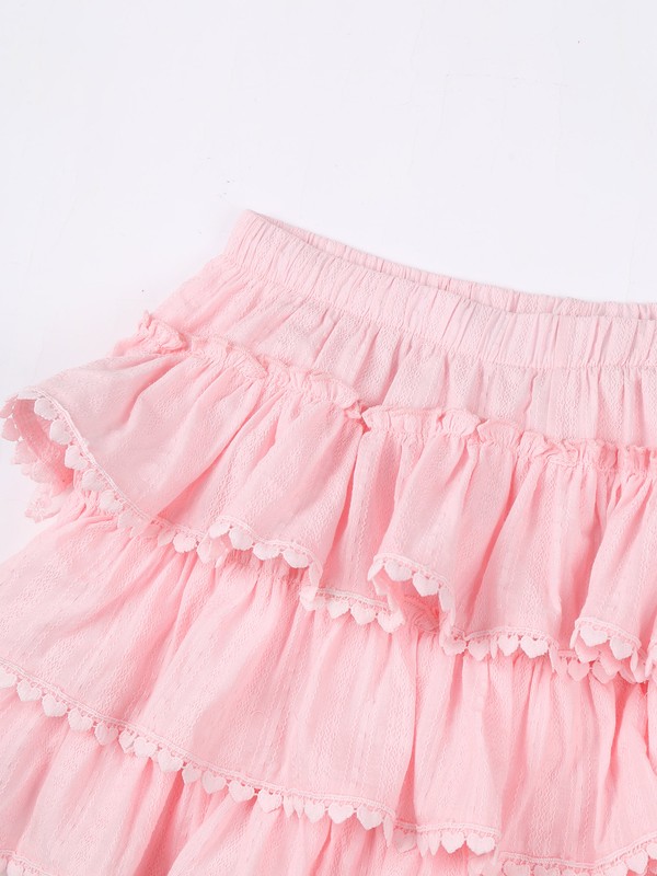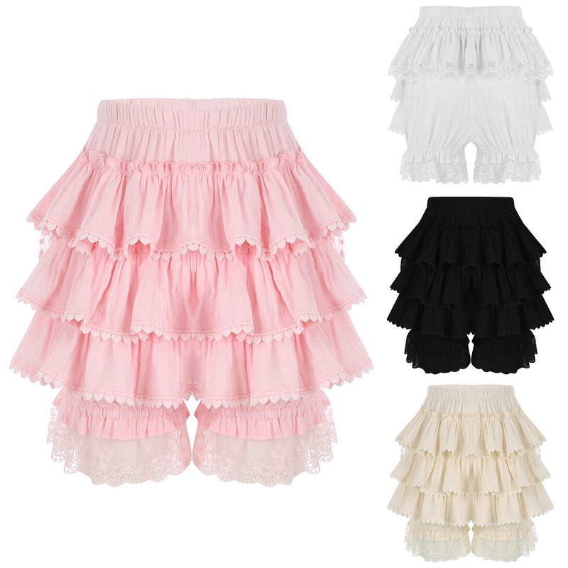 Women’s solid color bloomers shorts with tiered ruffles design and lace trim make it look cute and feminine.