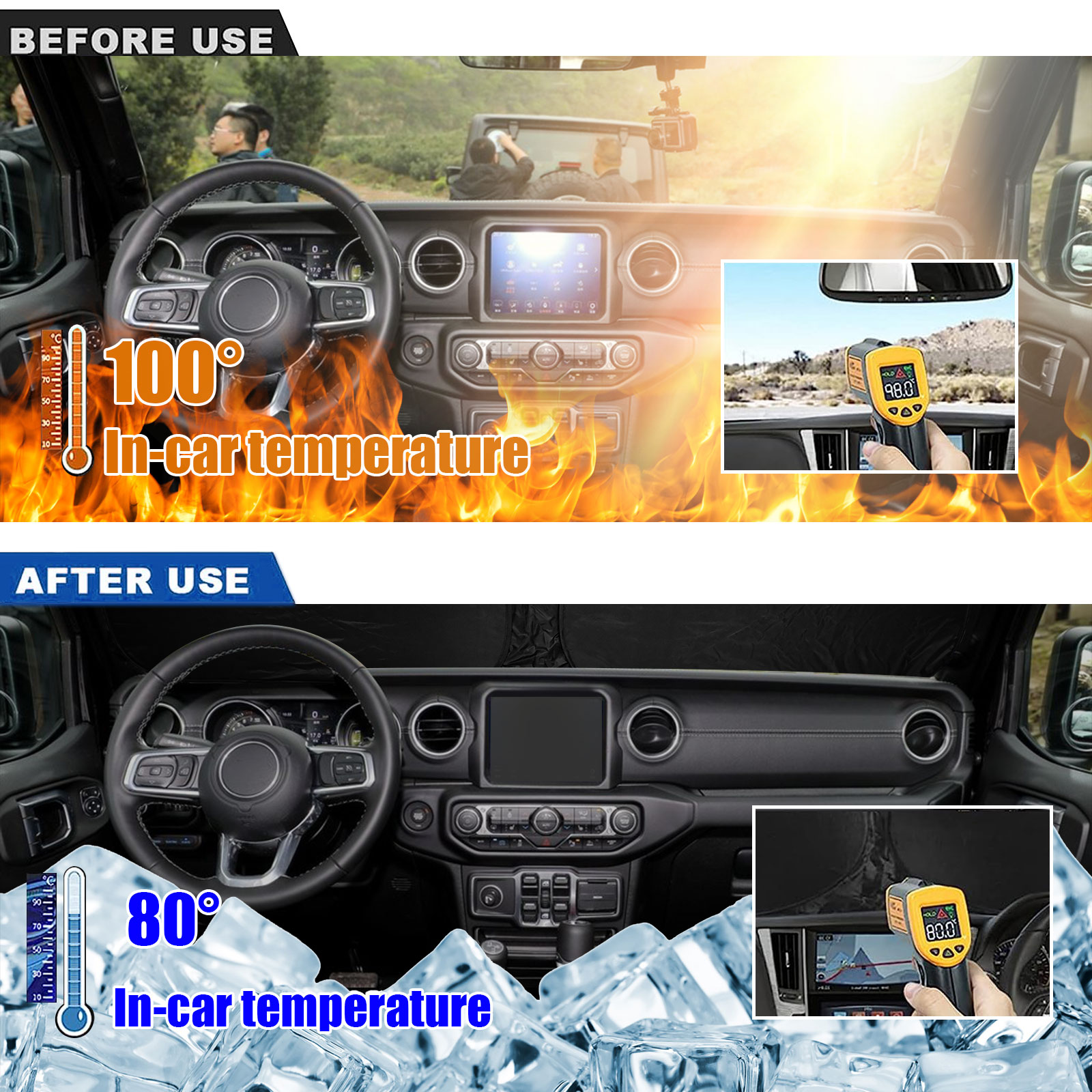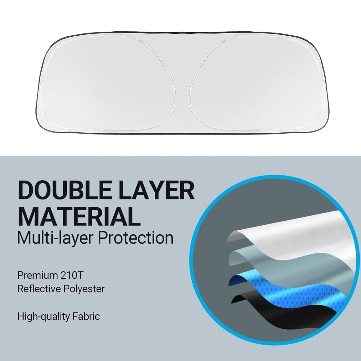 Upgraded Design: Unlike other products on the market, we use a double layer of heat shield fabric to keep out the sun. The first layer is premium 210T reflective polyester and the second layer is high-quality fabric. Double insulation, and double protection.The best shade and insulation on the market.
