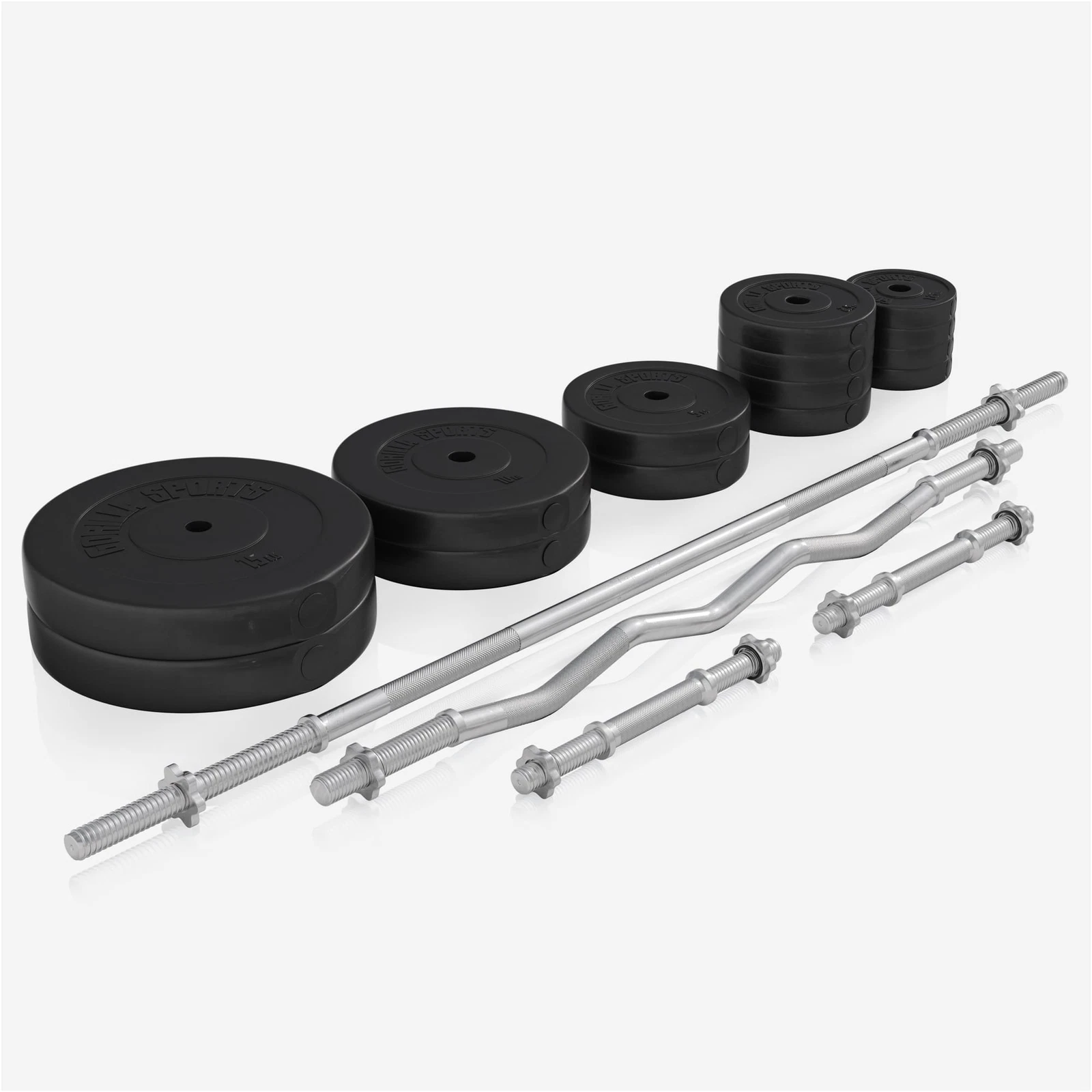 Im Angebot ist bereits ein Hantelkomplettset mit einem Gesamtgewicht von 100 kg enthalten. Das Set beinhaltet Hantelscheiben in verschiedenen Größen, Lang- und Kurzhantelstangen sowie Sternverschlüsse zur Sicherung der Gewichte. Die Hantelscheiben haben einen widerstandsfähigen und bodenschonenden Kunststoffüberzug und einen Lochdurchmesser von 30/31 mm.