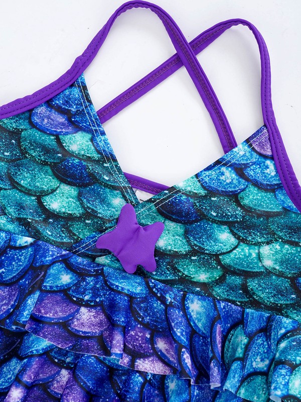 Spaghetti shoulder straps are criss cross at back, V-neckline with a stitched starfish. Swim tops front with 3 tiered ruffles, printed with scales pattern.