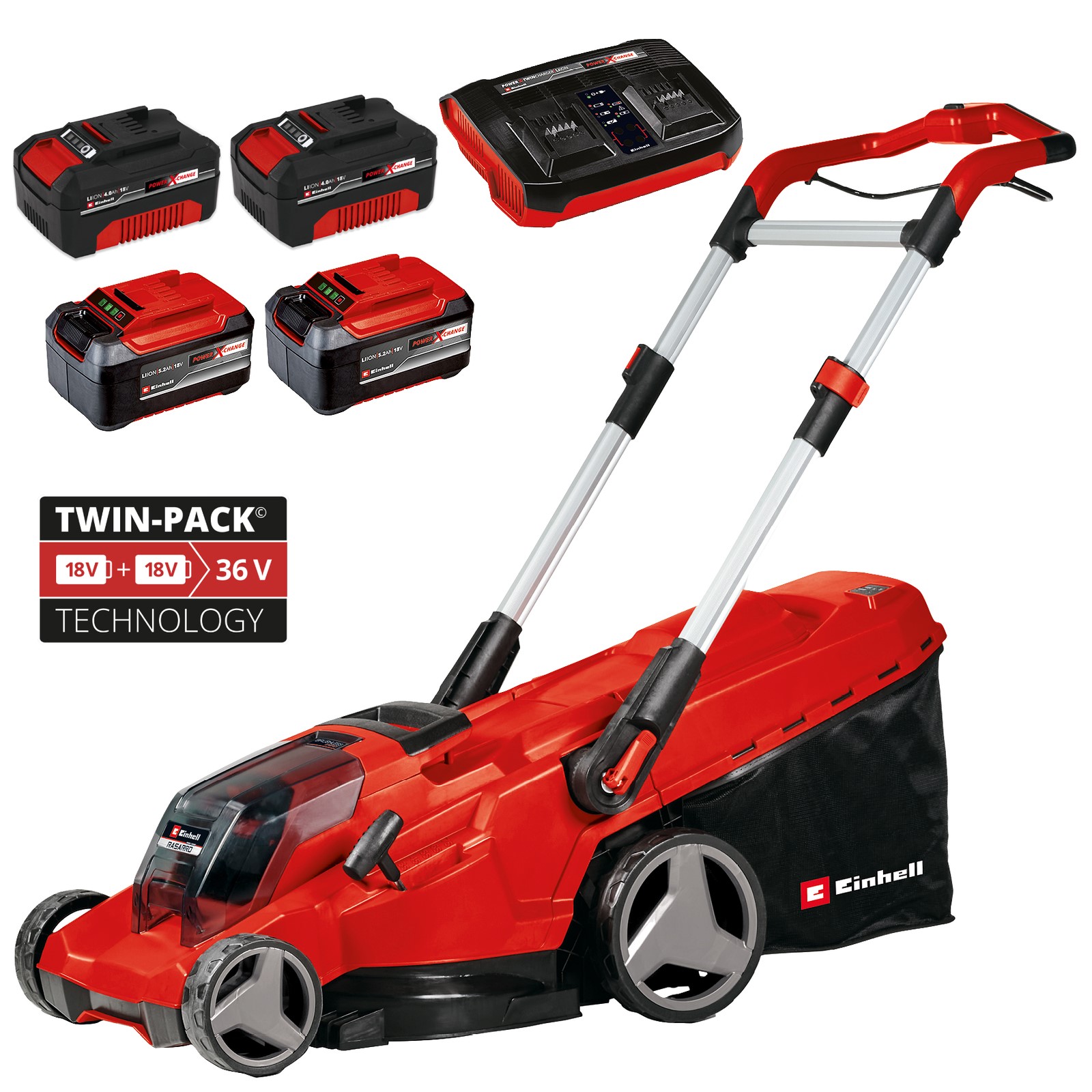 Einhell Cordless Twin 18v / 36v Lawnmower 42cm RASARRO 36/42 PXC - 4 x Batteries