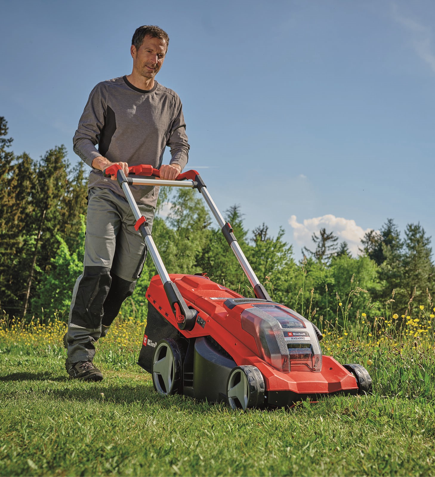 The RASARRO 36/42 is equipped with a height-adjustable, telescopic and foldable guide bar. This allows it to be perfectly adapted to any height and stowed away in a space-saving way. As a high wheeler, the cordless mower has raised rear wheels making it easier to work in difficult terrain. Its large wheels also protect the lawn.