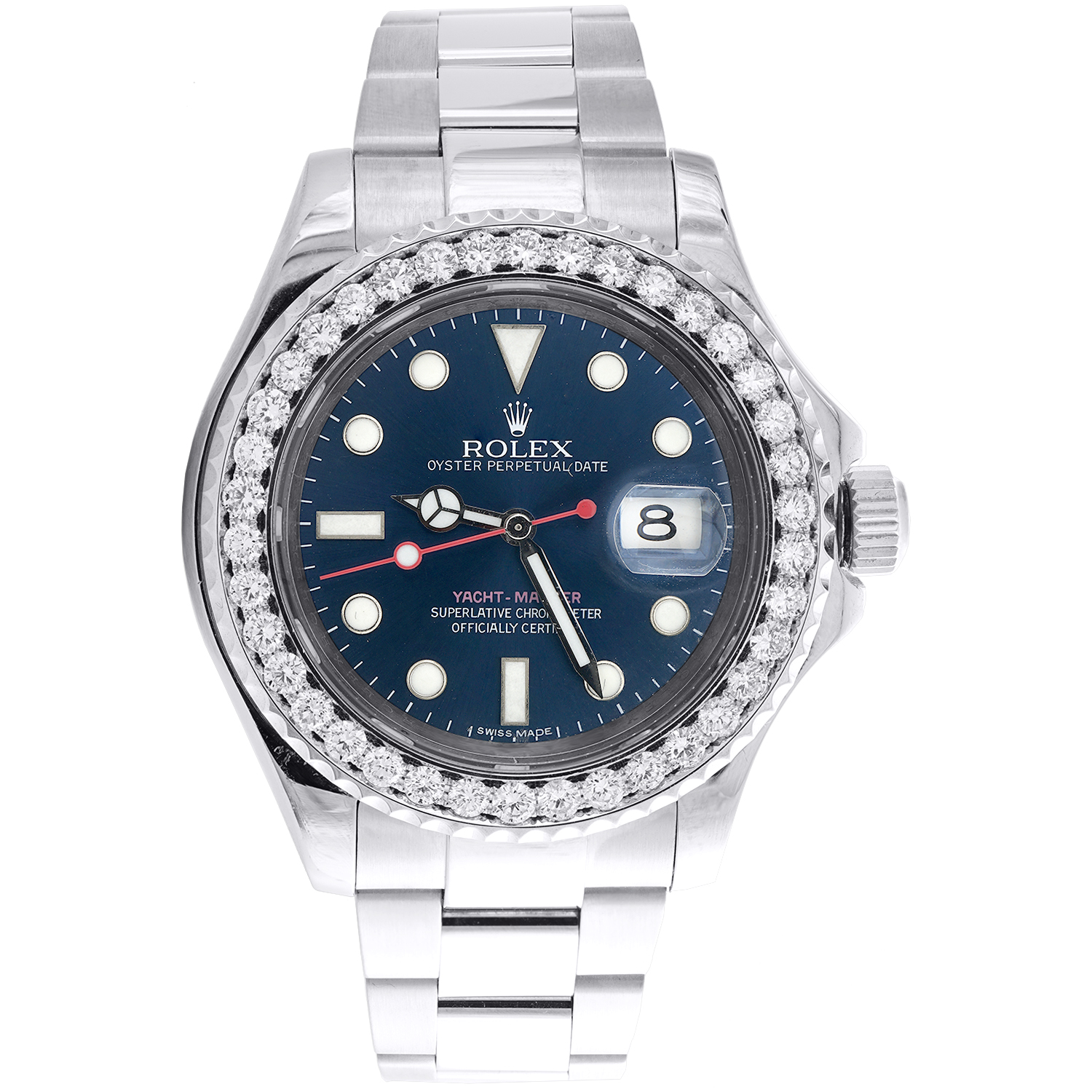 This watch is a Genuine Pre-Owned Men's Rolex Yacht-Master 40mm Sport Watch Model (reference # 116622) with custom diamond bezel. This men's Stainless Steel watch has 2.55 ct. t.w. of genuine diamonds that are hand set. This is a full size 40mm desired model for Men's. This watch is in excellent condition and looks brand new on the wrist. The original stainless steel case is in excellent condition with no dings, dents or deep scratches. The aftermarket diamond bezel makes it 39mm when on the wrist. The crystal has been replaced with a brand new parabolic sapphire scratch resistant crystal. The Bright Blue aftermarket dial is added onto the watch. The watch consists of hand set SI1 | F- G quality diamonds. The OEM Factory Original Oyster Band on this watch is Stainless Steel. Diamonds set in this watch are done In-House so we can control the the craftsmanship and quality of work that we provide to our clients. The movement in this watch has all original / OEM Rolex parts. The oyster style bracelet fits up-to an 8 inch wrist size. The movement has been recently serviced so this timepiece is ready to wear. Comes with the original OEM Box.