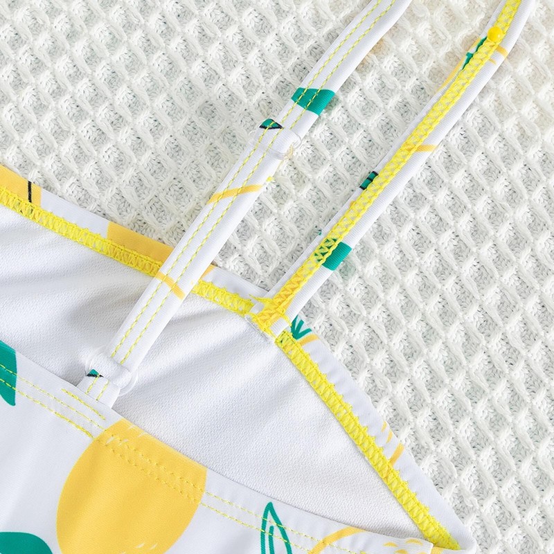 Ruffle around waist with the fruit print make girl look more cute and beautiful at beach.