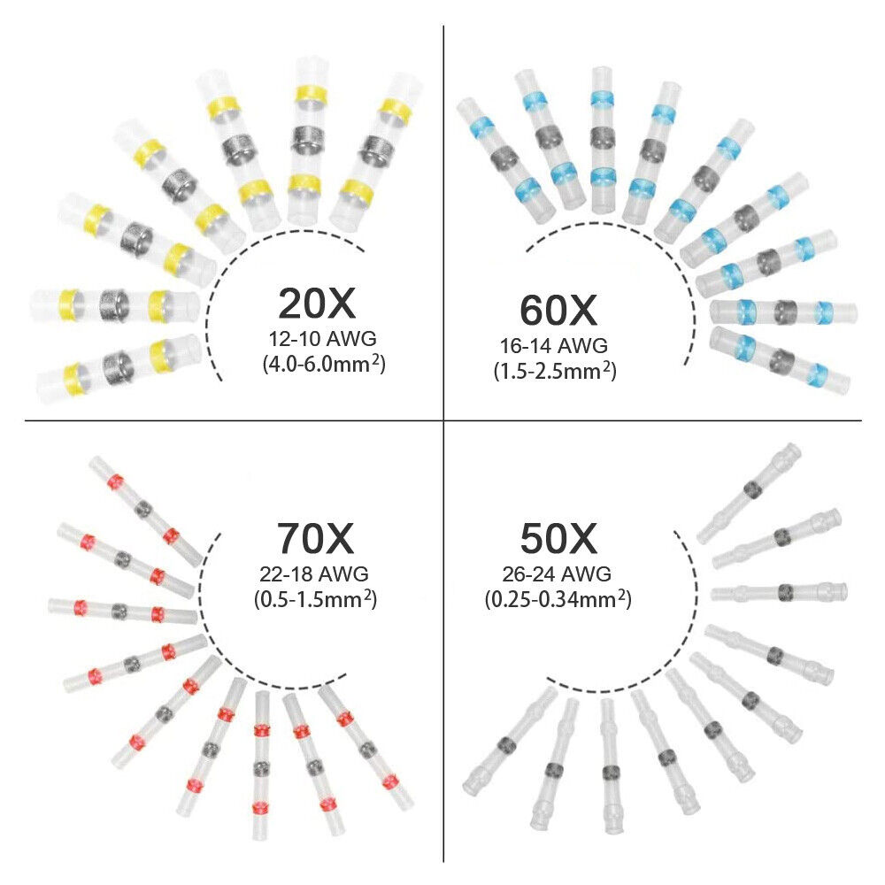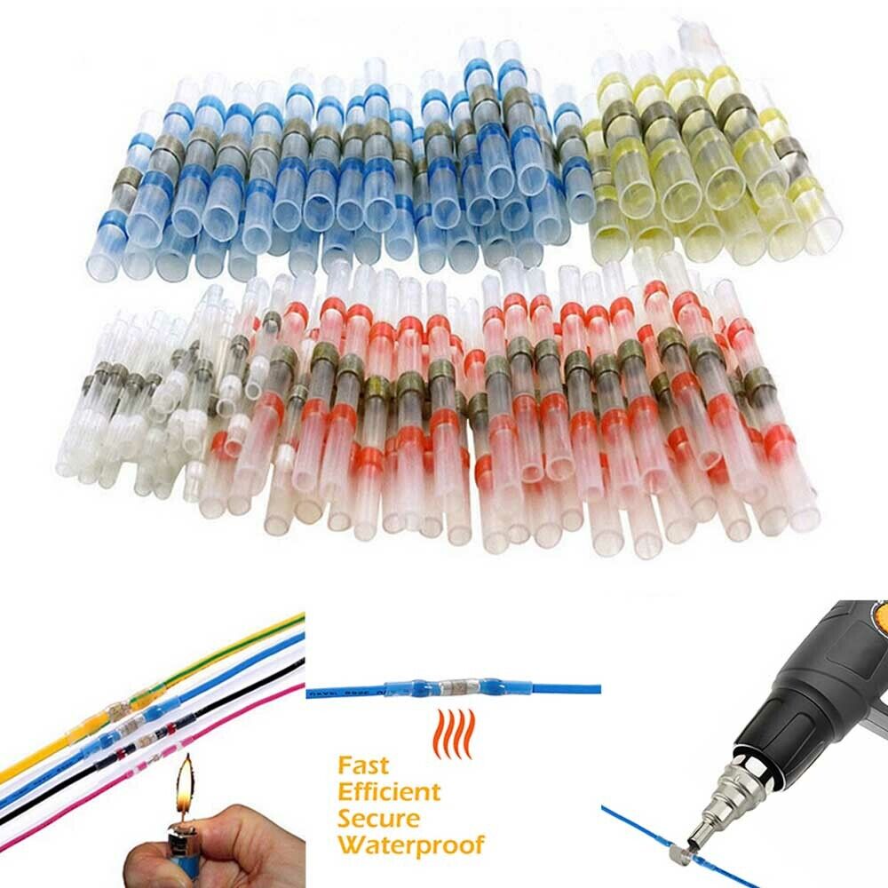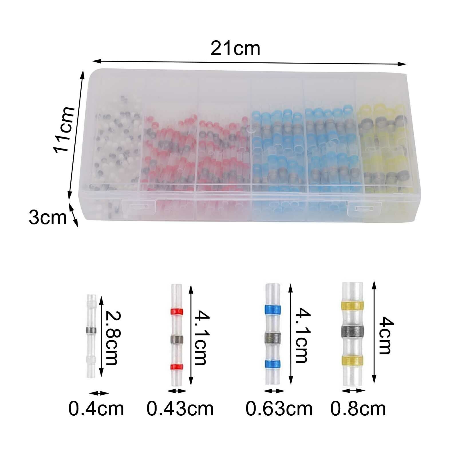 【4 Sizes】: High quality solder seal connectors, Red size fits (0.5-1.5mm²), Blue size fits (1.5-2.5mm²), White size fits (0.25-0.34mm²), Yellow size fits (4 .0-6.0 mm²), melting point (138 ° C) shrinkage ratio 3: 1