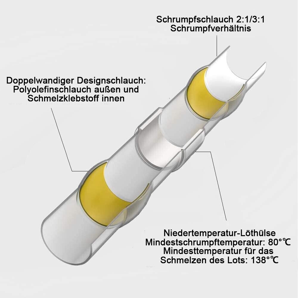 【High Quality】:Compliance with all relevant European standards. The double-walled design (external polyolefin tube, internal hot melt adhesive and solder) ensures perfect insulation and waterproof performance, and can prevent wire corrosion even in humid environments.