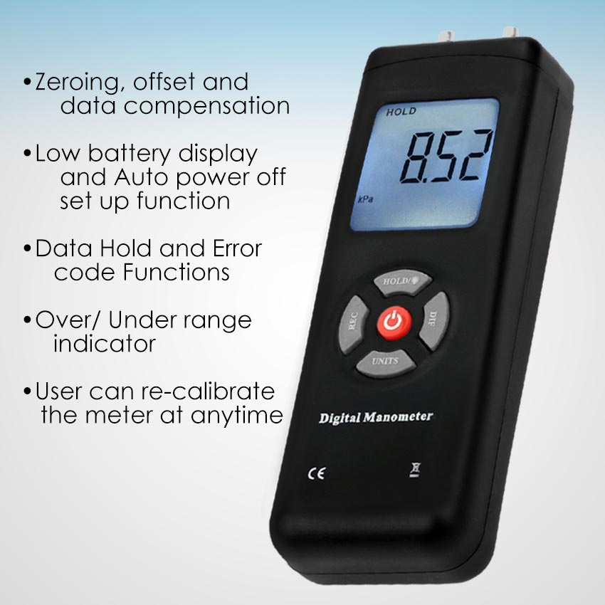 This Professional Digital Manometer is a typical useful measurement for various pressure testing,such as HVAC/R refrigeration air-conditioning industry used to measure the pressure difference,Medical facilities,Measure negative pressure setting to ensure indoor air pests will not pollute the air in the outside world,Measure the positive pressure,and Computer peripheral equipment pneumatic control .
