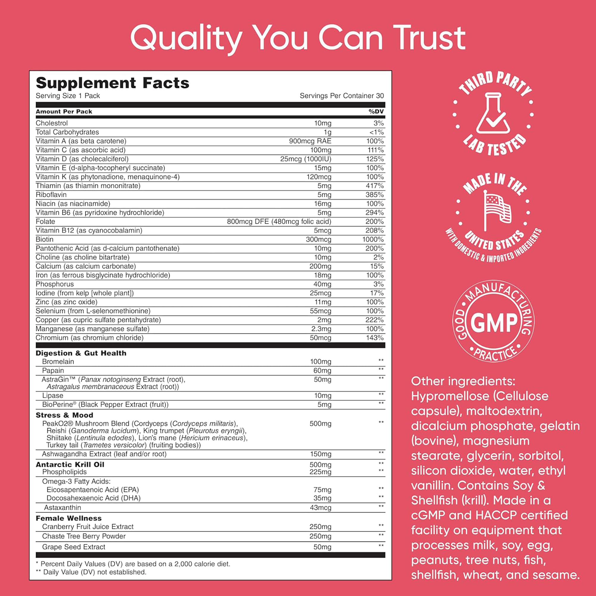 The Universal Women's Total Health Pack is an expertly curated formula for optimal women's health. It helps fill nutritional gaps, support sustained energy, manage stress and mood, and promotes female wellness. It also features sustainably sourced Antarctic Krill Oil with premium Omega-3s for heart health and a healthy inflammation response. It includes the well-known adaptogen Ashwagandha and the organic PeakO2 mushroom blend for mental, emotional, and physical stress and mood support.