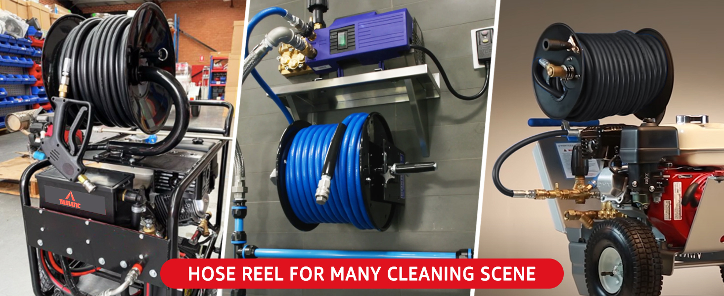 - ★【Easy to Use】The hose reel is equipped with smooth hand crank for easy rolling, pin lock helps prevent unintentional hose unreeling; brass swivel for easy pressure connection; Great time & effort saving when tidying up long lengths of pressure hose.