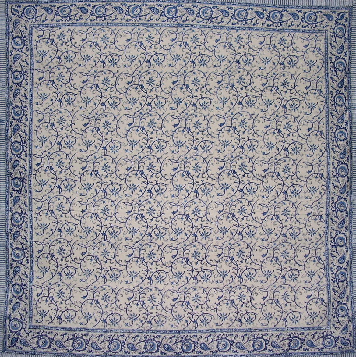 TABLECLOTH-SQUARE ~ Gorgeous Rajasthan Vine block print square tablecloth. Measures approximately 60 x 60 inches. Made of 100% quality cotton. They are color fast and can be machine washed separately on cool/gentle and tumble dried. Beautiful shades of true blue on bright white. Rajasthan is the most colorful state in India and it is reflected in it's forms of textiles. The tradition of printing with finely engraved wooden blocks distinguishes it from other states. The block printed textiles of India became famous in the 16th and 17th centuries in Europe when the East India Company began to export them in bulk. The block prints are mostly executed on a white or off white background, using screen printers or wooden blocks. They are usually colorful floral patterns and known for their fine and intricate detailing. The Rajasthan block print designs created centuries ago remain ever popular through out many cultures around the world today. These gorgeous Rajasthan block prints will add a unique quality to your dining experience. Many of our tablecloths have matching placemats and napkins that can be purchased individually. You will love the rich colors and quality of this Rajasthan block print. Your Rajasthan Vine tablecloth can be used for: