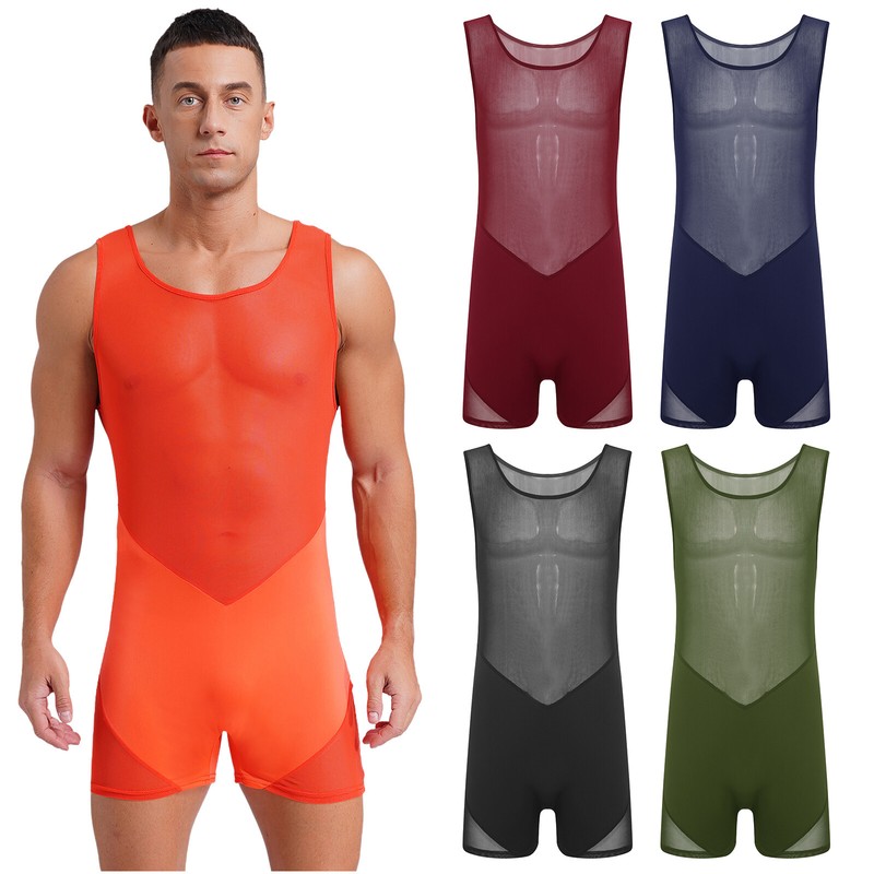 Glossy stretchy bodysuit for men, solid color, round neck, short sleeve, simple but stylish.