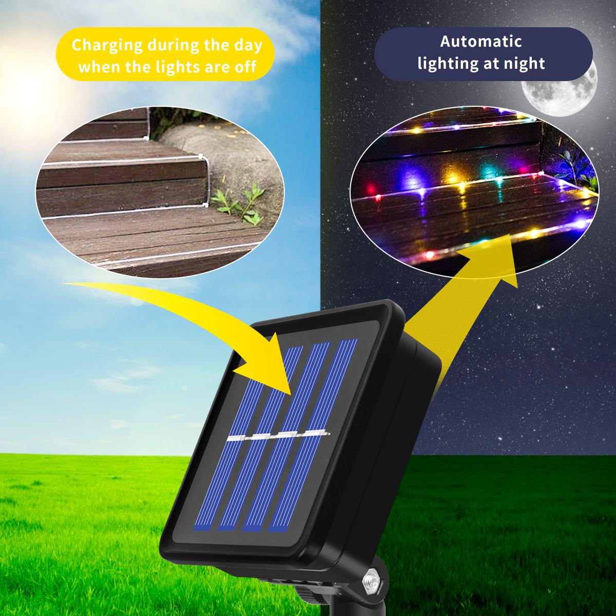 Attention: Shadows or weather have a significant impact on the running time of solar string lights. Solar panels must be placed in a shaded location to receive maximum sunlight during the day. Rainy and cloudy days will darken. The solar panel can be easily adjusted to 270 °. To maximize the running time of the solar string lights, please ensure that the solar panels are charged in direct sunlight
