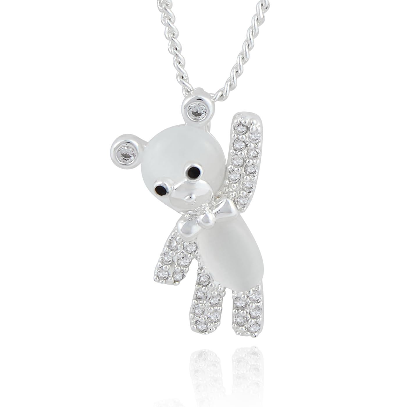 Equilibrium presents a girl’s silver-plated necklace with a teddy bear pendant. This necklace is plated with real silver to create a longer lasting high-quality necklace. The centrepiece of the necklace features a pendant in the shape of a teddy bear with sparkly gems across the arms and legs. This fun necklace makes the perfect gift for anybody.