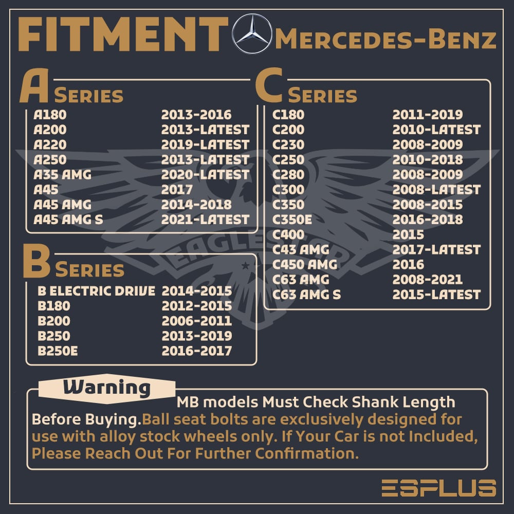 Compatibility chart from Ebay is only designated for Thread Pitch check. The actual fitment varies based on the requirements of wheels. Lug nuts/bolts seat has to strictly follow the wheel condition. If you are not sure, please do not hesitate to ask customer service.