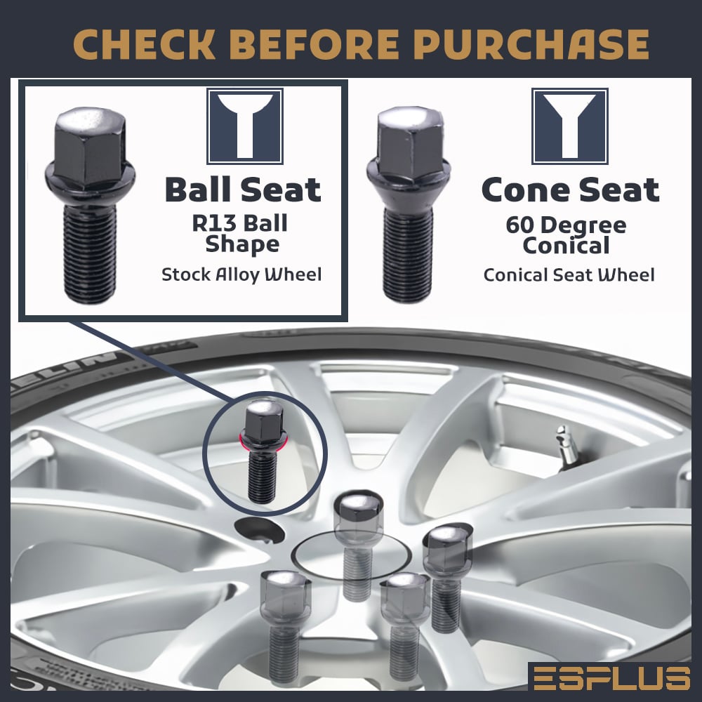 For stock wheel users, we suggest to use shape of existing lug Bolts' Flange, Seat Type, and Shank Length as refernce before buying.