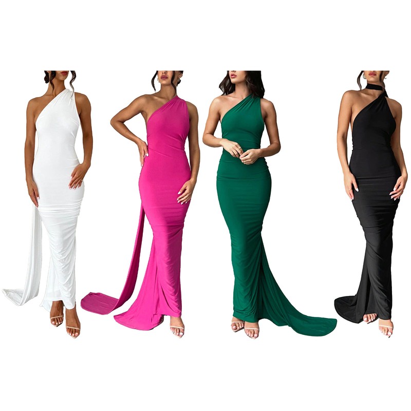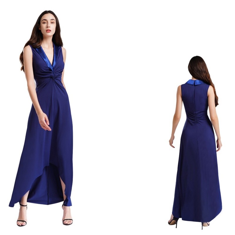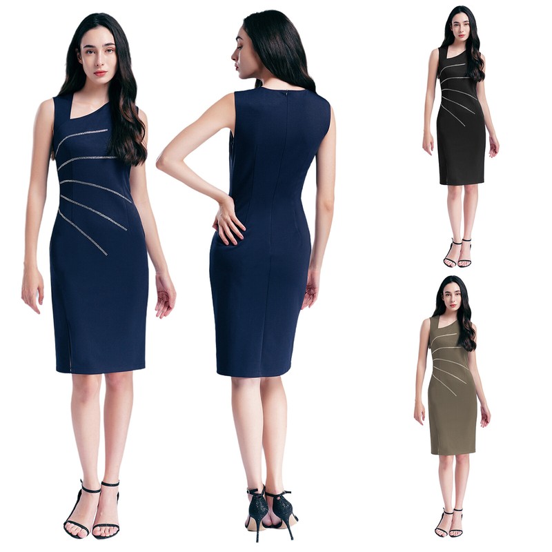 Metallic shiny fabric around the waist highlights your slender waistline. Back invisible zipper for easy wearing.