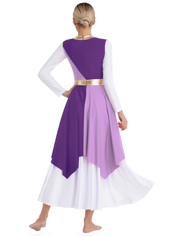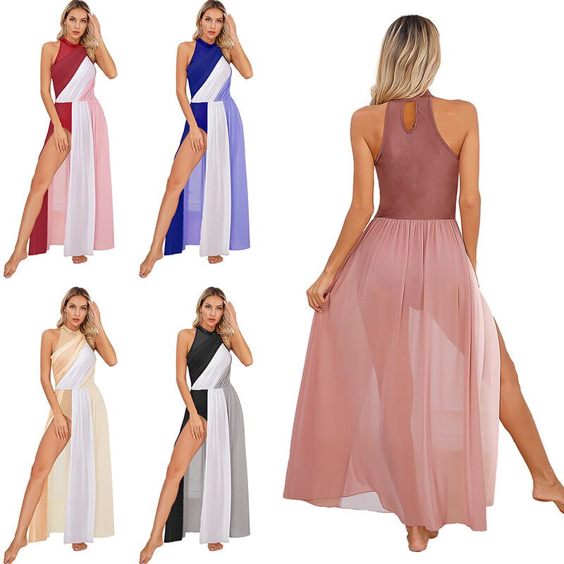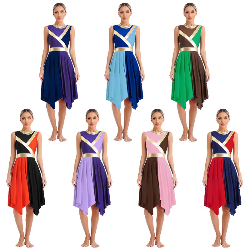 Sleeveless liturgical dance dress for women, color block patchwork design, classic round neck, simple but stylish.