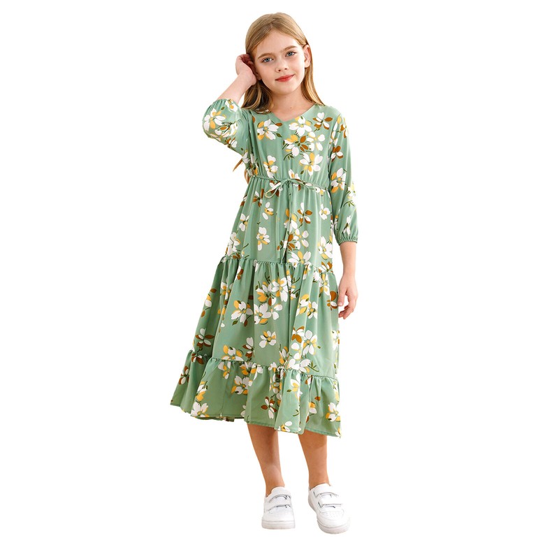 Designed with v neck, long sleeve, no lining, high waist a-line dress with ruffle hem.