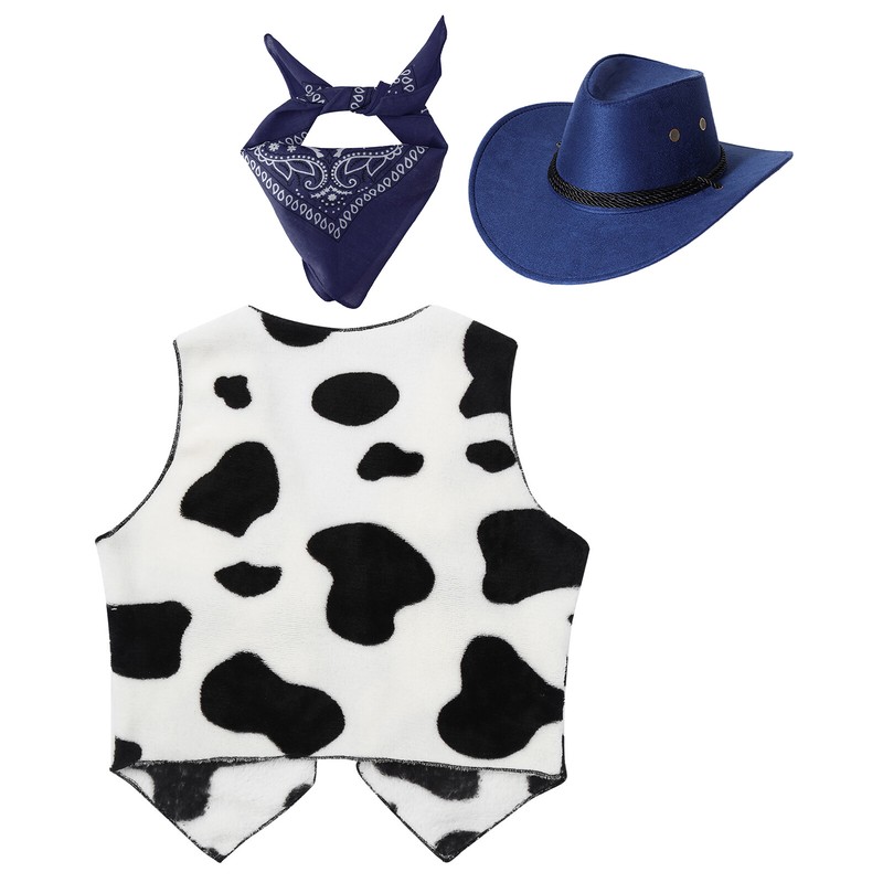Cute cowboy vest is open front(no fastenings), and features with a black and white cow pattern.