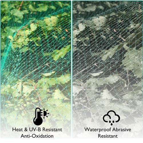 Feature: ✔ Premium Material:The anti-bird net is made of high-quality polyethylene material, which is not only corrosion-resistant, but also durable, can withstand the effects of sunlight and harsh weather conditions, and is not easy to tear. ✔ Protect Plant: This net can prevent birds from eating plants and fruit crops, and can effectively protect birds from damage, it can be used in agriculture, such as gardens, vineyards and vegetable farms, etc. ✔ Photosynthetic Absorption: The supporting structure of the anti-bird net enables light and moisture to reach fruits and crops, so that plants can absorb sunlight, which can be used for a long time in the open air. ✔ Easy to Install: The anti-bird net is easy to install, just open the anti-bird net and cover it where you want to use it, such as trees, gardens, grass, farmland, etc., it can be used directly, very simple and convenient.