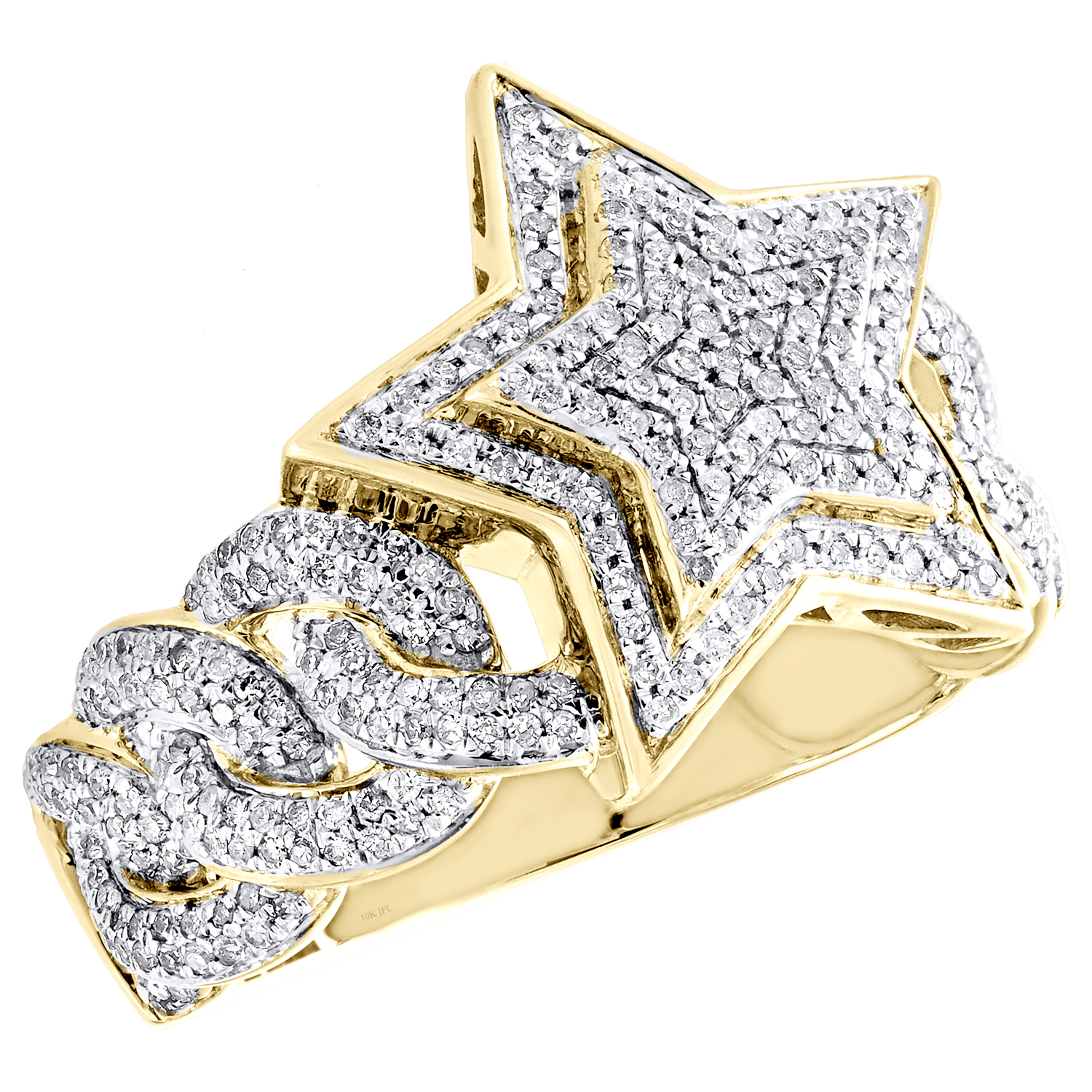 A bold and manly look, this sparkling diamond ring is just the perfect style for him. Brilliantly casted in 10K Yellow Gold, this ring features sparkling diamonds set in 17mm wide frame. This ring design was intricately thought out so it can be worn for any occasion, no matter how casual or fancy. Miami Cuban Shank w/ Super Star frame with diamonds is the focal point of this fancy statement band, making a bold fashion statement. Make an impression with this exclusive ring captivating 3/4 ct. t.w. of genuine Round cut diamonds, with high polished to a lustrous shine. This ring is comfort fit and weighs approx. 8.6 gr. All diamonds are 100% genuine and are matched to perfection. The diamonds are secured in Pave setting, making the overall appearance larger and lustrous. Available in size 10. If a different size is needed, please send us a message, sizing charges apply.