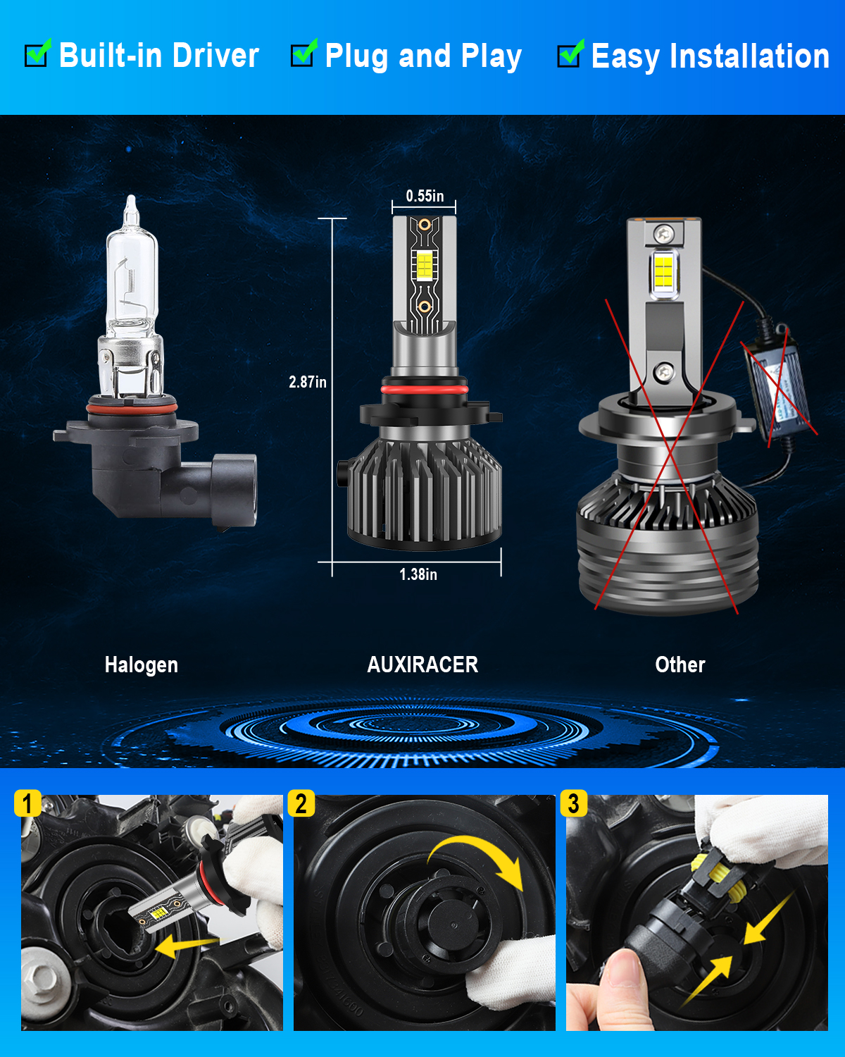5-MINUTE INSTALLATION: All-in-one design, bulid-in driver for taking up less space in housing, no bulky external driver, no extended bulb base, no more modification on housing or cover. Real plug and play, smoothly fits into vehicle's housing and factory sockets even with limited space in original housing.
